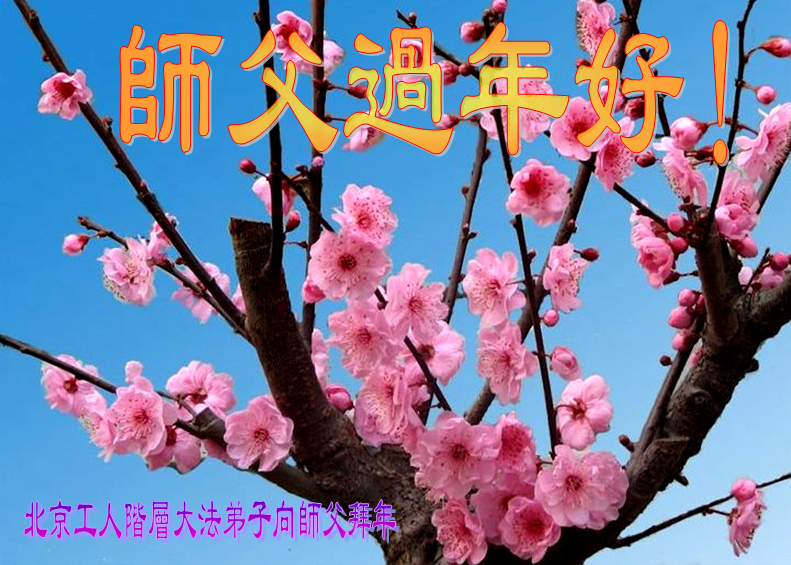 师父过年好!我们夫妻俩向师父拜年! 在这十几年的修炼中,在师尊的慈悲呵护下,我们夫妻俩磕磕绊绊的走到了今天,在正正法的最后阶段,我们一定做好师父交给的三件事,完成自己对您的承诺,救度众生,圆满随师还! 北京海淀区夫妻大法弟子 二零一四年一月 北京工人阶层大法弟子向师父拜年!