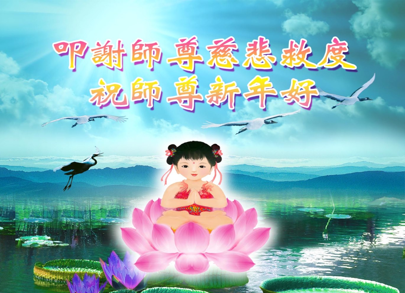 江苏省淮安市淮安区两人学法小组大法弟子叩拜师父,给慈悲的恩师拜年!恭祝师尊新年快乐! 弟子决心谨遵师尊教诲,做好三件事,恭迎师尊早日回归中原! 黑龙江省绥化市安达市大法弟子恭祝师尊新年快乐!