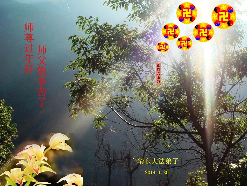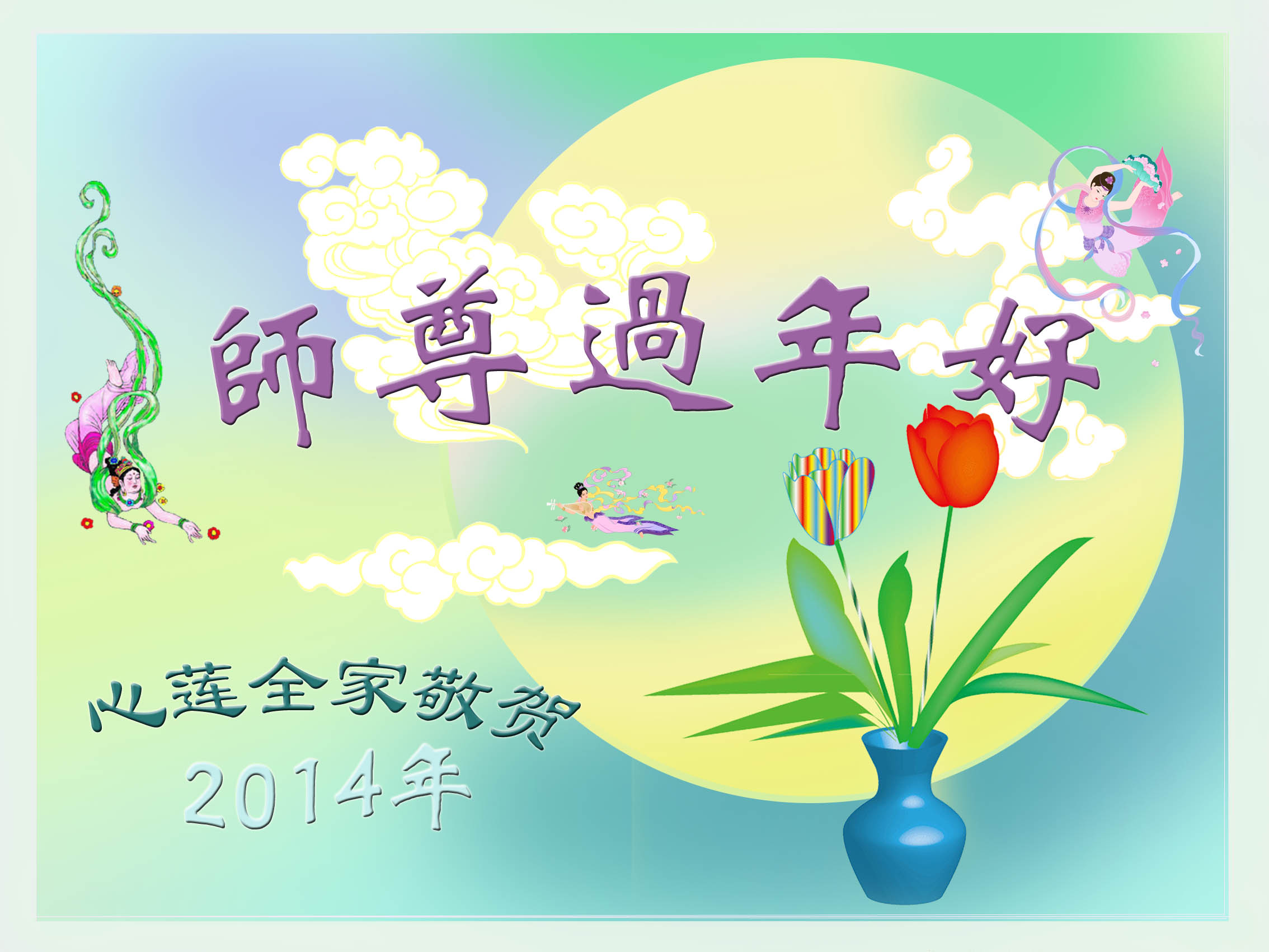 师尊过年好!大法恩泽我全家,身心受益得福报,主佛洪恩浩大穹,泪洒胸前谢师恩!在大法中修炼是我们的荣幸,在新的一年,弟子们要做的更好,唯愿师尊笑 心莲全家敬拜 2014.1.10 华东大法弟子恭祝师父过年好!