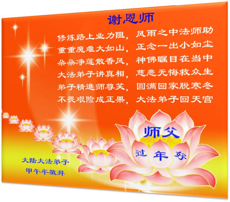 新春佳节即将来临之际,弟子们送上一份遥远的祝福,恭祝伟大的师尊新年快乐!弟子们想念您。 大陆大法弟子恭祝慈悲伟大的师尊新年好!