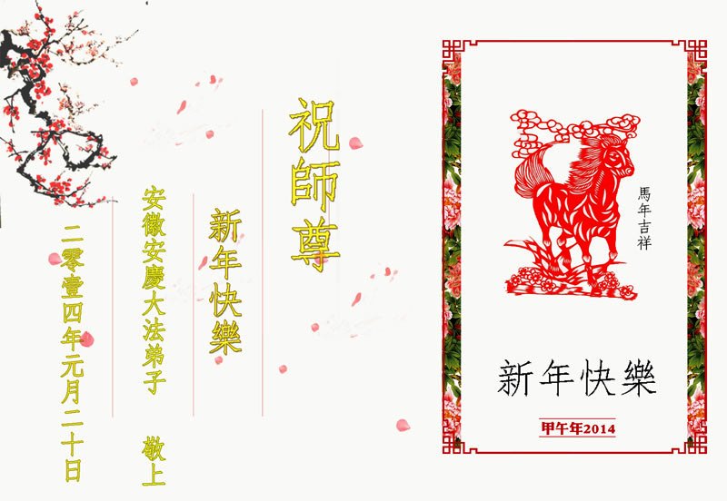金蛇隐去,骏马驰来。师尊的辛劳与承受,弟子却不能报答之万一,弟子只能常鞭策自己,努力做好三件事,珍惜生命多救人,让更多的人得救,让更多的人感恩大法。大年将至甲午伊始,弟子给伟大慈悲的师尊叩首拜大年! 师尊您辛苦了!师尊,弟子恭祝您新年快乐! 安徽铜陵大法弟子恭祝慈悲伟大的师父大年好!新年快乐!