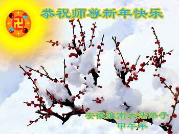 安徽淮南大法弟子恭祝慈悲伟大的李洪志师父新年快乐!叩谢师尊慈悲救度! 给师尊献上弟子的一片心: 傲雪寒梅 傲雪寒梅迎春笑 出世圣莲凡尘开 意志百炼金刚铸 三事功成回家园 安徽省亳州市利辛县全体大法弟子恭祝师尊新年快乐