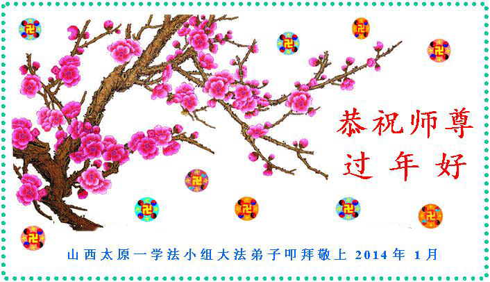 在这新年到来之际,向慈悲伟大的师父拜年!恭祝师父过年好!感恩师父的慈悲救度! 师父辛苦了!我们想念您!我们会继续做好三件事,义无反顾的讲清真相,让世人做出正确的选择,不留遗憾在人间。我们一定无愧于正法时期大法弟子称号,请师父放心。 山西省晋城市一学法小组全体大法弟子 叩拜! 二零一四年元月十七日