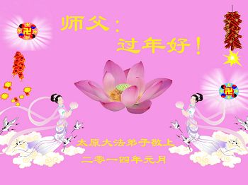 弟子们向慈悲伟大的师尊致以节日的问候!感谢师尊的慈悲苦度和精心呵护!在新的一年里,我们要更精進,努力做好三件事。遇事向内找,修好自己,多多救人,完成使命,做好我们该做的事,让师尊少一份操劳,多一份欣慰,圆满随师还。 陵川县全体大法弟子跪拜! 二零一四年元月十六日 山西太原大法弟子恭祝师尊新年快乐!