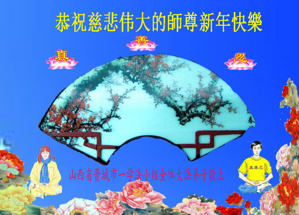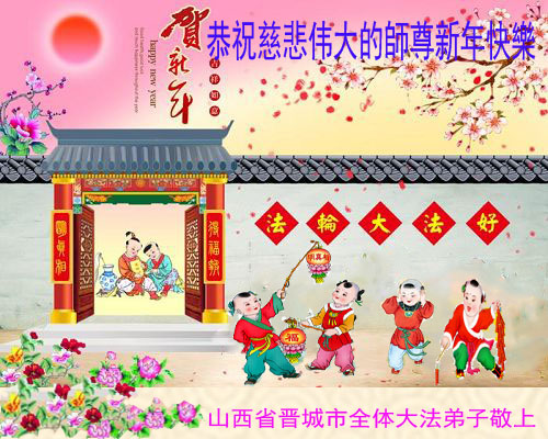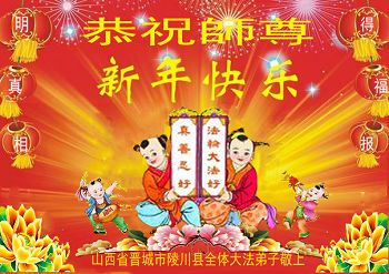 在新年到来之际,我们晋城市全体大法弟子向伟大的师尊叩拜,恭祝师尊新年快乐!请师尊放心,在新的一年里,我们会更加精進,整体提高,努力做好三件事。学好法,修好自己,抓紧时间讲真相救众生,不管遇到什么魔难都会保持正念,都会坚信师父,坚修到底,决不辜负师尊的慈悲苦度,圆满随师还。 山西省晋城市全体大法弟子合十叩拜! 山西省晋城市陵川县全体大法弟子恭祝慈悲伟大的师尊新年快乐!