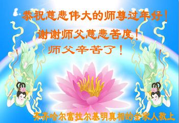 我的女儿一九九四年开始修炼法轮大法,很早就向我和她的父亲洪法,可惜我俩当时缘份未到。女儿遭迫害初期,我们很担心也很无奈,因为在以往,遭到共匪迫害的人就算侥幸活下来,境遇多很凄惨,所谓“平反”换不回他们被掠夺的光阴和机会。可是法轮大法来了,大法和大法弟子们把“邪不胜正”的天理从新展现给了我们!十五年过去了,女儿和同龄人相比,是那样的年轻、幸福和智慧,她说所有被邪*党-掠去的,师父都给了她更好的。女儿的经历,也让我们从新看到了生命的希望!谢谢最伟大的师父! 大陆大法弟子的家人恭祝法轮大法师父新年好!
