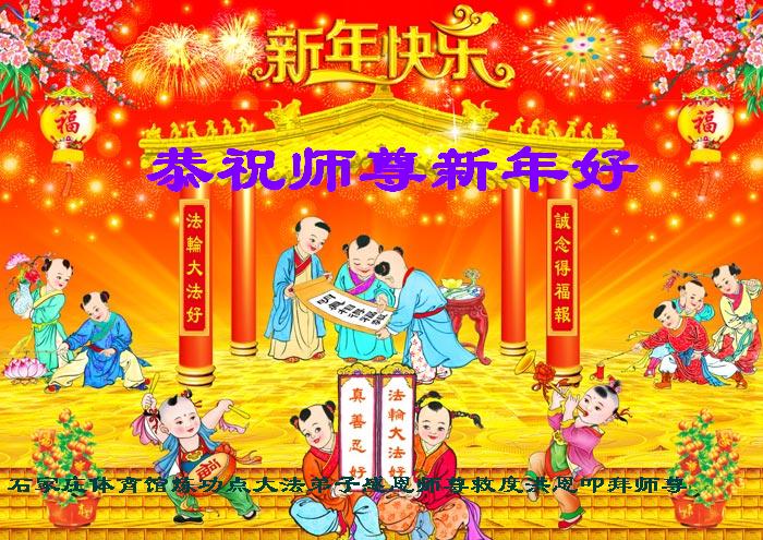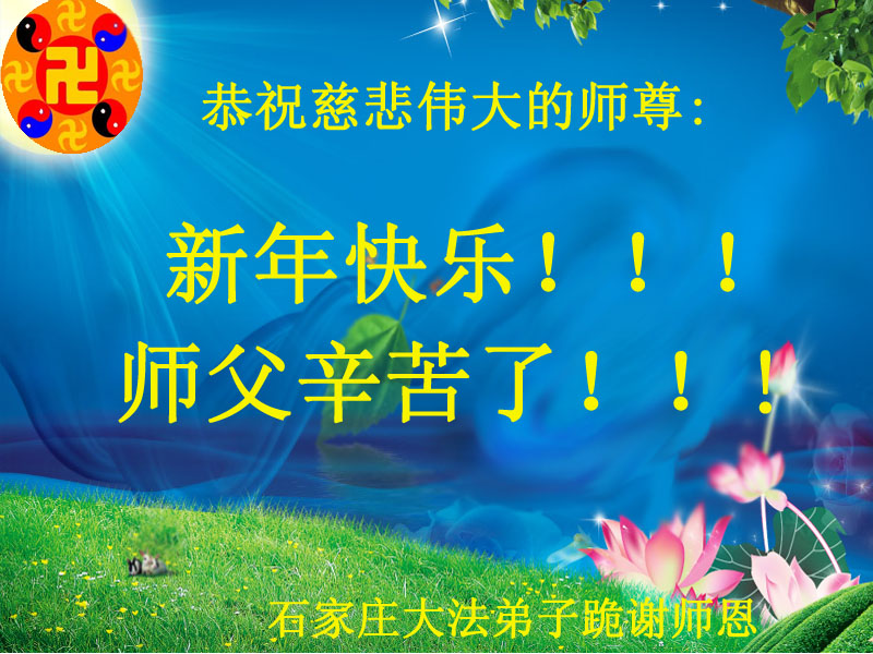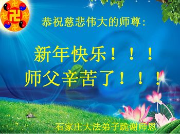 师尊您辛苦了!弟子一定走好最后的路,精進实修报师恩,圆满随师返家园。 谢谢师尊的慈悲苦度。 石家庄大法弟子 河北省石家庄全体大法弟子恭祝师尊新年快乐!