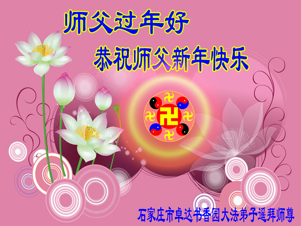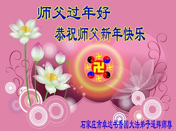 石家庄市全体大法弟子向慈悲伟大的师尊拜年!恭祝师尊新年好!叩拜师尊救度洪恩! 弟子在祖国无时不在思念远在万里他乡救度洪宇苍生的伟大的师尊!弟子在最后有限的时间里,一定努力学好法,做好三件事,多救人 。不辜负师尊的慈悲救度与期盼。弟子祈盼早日见到日夜思念的慈悲的师尊!弟子眼含热泪叩拜师尊!合十! 石家庄市全体大法弟子敬呈 河北省石家庄市桥西区留营华苑大法弟子恭祝慈悲伟大的师尊新年快乐!