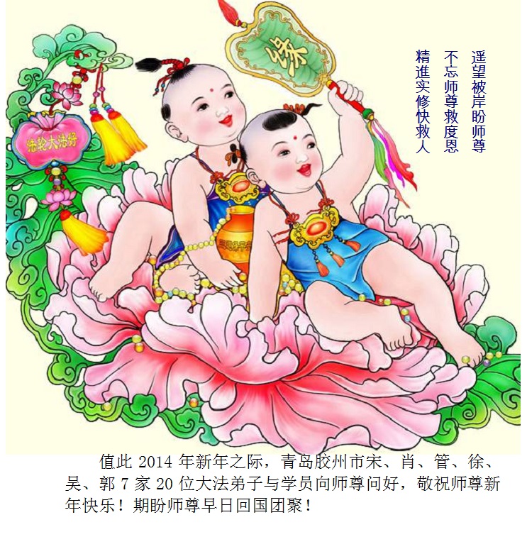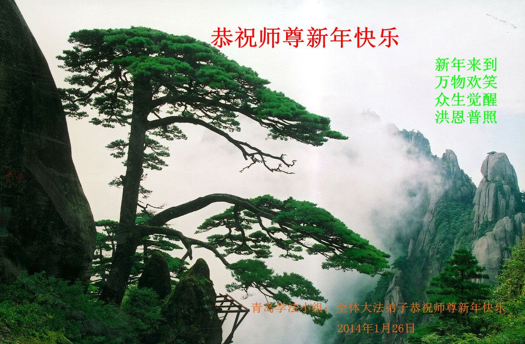 在甲午年新年到来之际,我们青岛一学法小组的全体新、老弟子与全世界的大法弟子一样,怀着无比激动与感恩之心,恭祝我们至高无上的师尊新年快乐!我们决不辜负师尊及我们自身世界众生的期盼,更加精進的做好三件事,争取做到不留任何遗憾的圆满随师还! 马到成功 辗转轮回幸得法, 先他后我修真性, 助师正法增威德, 快马加鞭返祖庭。 青岛一学法小组全体大法弟子 二零一四年一月二十日 山东青岛市大法弟子恭贺师尊新年快乐!
