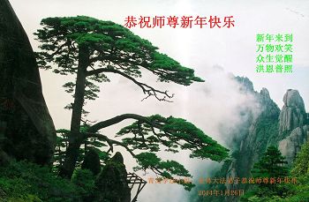 在新的一年里,我们将一如既往,学好法,修好自己,广救众生,决不辜负师父的厚望。全体大法弟子九叩敬谢师尊慈悲救度之恩! 浮云随风消, 青山座地高。 川石难留水, 明月当日照。 师恩无限大, 弟子使命骄。 随师正法路, 指日返九霄。 山东省青岛市胶州市大法弟子恭祝师父新年好!