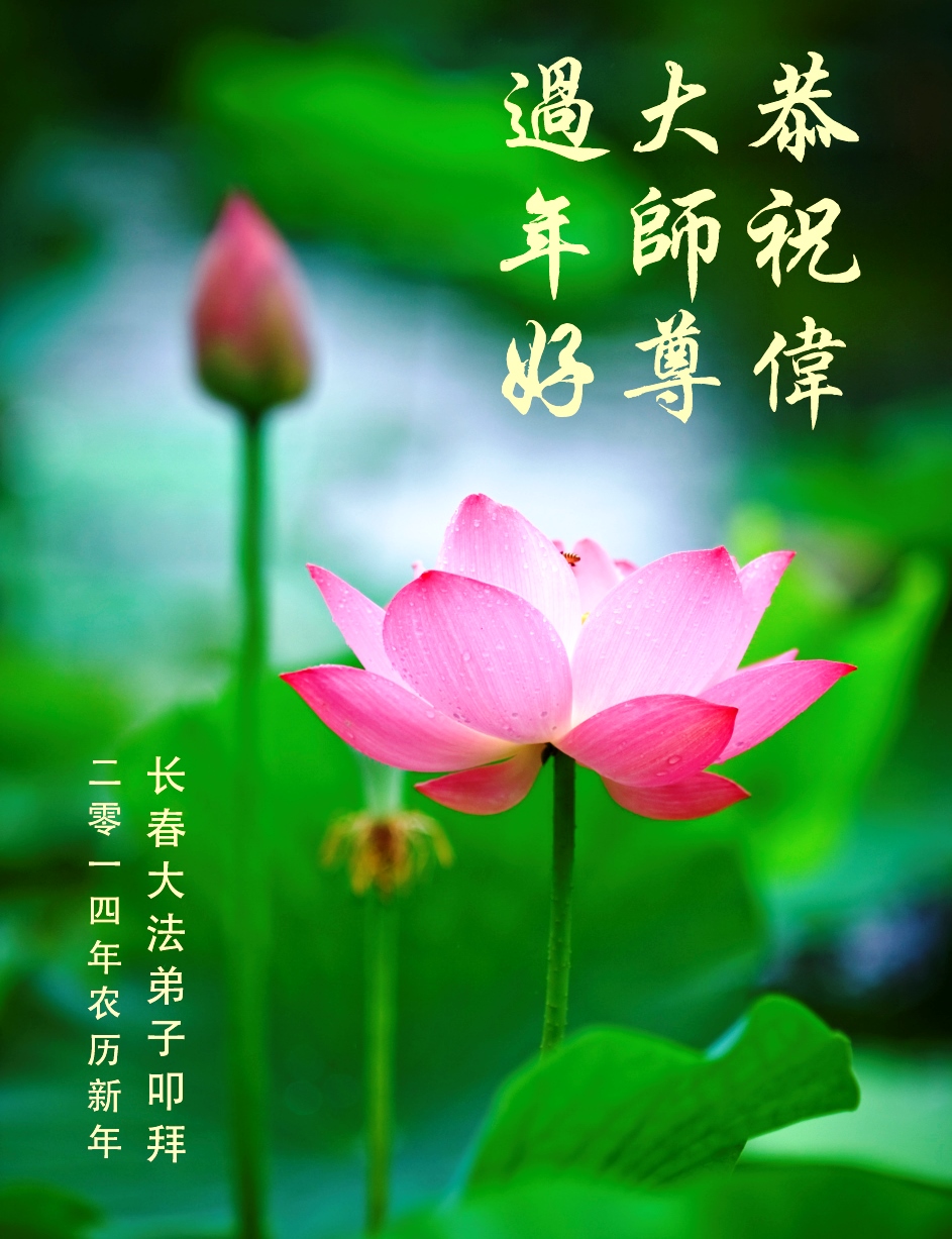 弟子们非常想念您!远隔重洋,借过年之际略表弟子们对师尊的一份深深祝福和无限感恩之情!弟子深知师尊为弟子们与众生的付出是生命的永远都无法报答的!唯有在剩余不多的正法时间里,精進!精進!再精進!不断的用法来归正自己,圆容师尊所要的,扎实做好大法弟子该做的三件事,兑现自己的誓约,努力多多救度众生,不给自己的修炼留下遗憾!也不枉师尊的慈悲苦度!尽量能让师尊多一份欣慰!少一些操劳!弟子们在此叩拜师尊!合十! 山东大法弟子敬上 二零一四年一月二十七日 北京一大法弟子恭祝师父新年好!