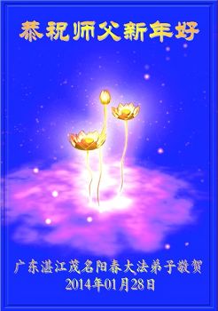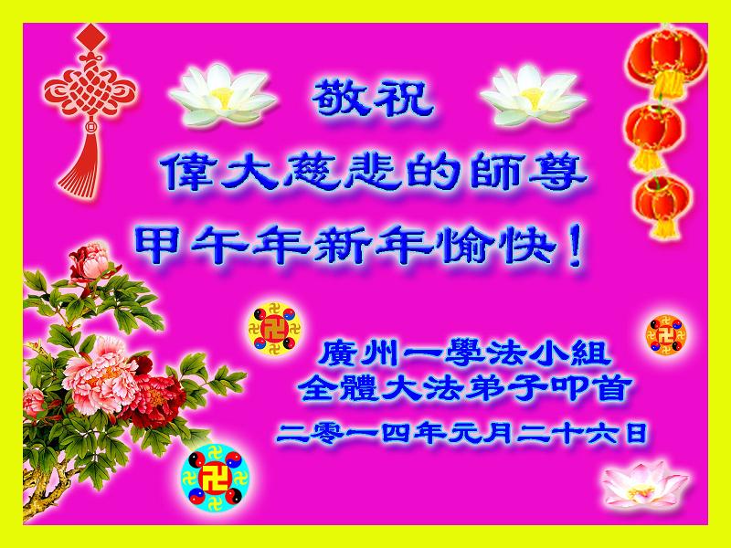 恭祝师尊新年快乐!谢谢师尊来世间传大法救度众生,使我们有幸得度。谨遵师尊教导,踏踏实实做好三件事,盼望师尊早日回来! 2014年1月26日 广东省广州一学法小组全体大法弟子敬祝伟大慈悲的师尊新年愉快!