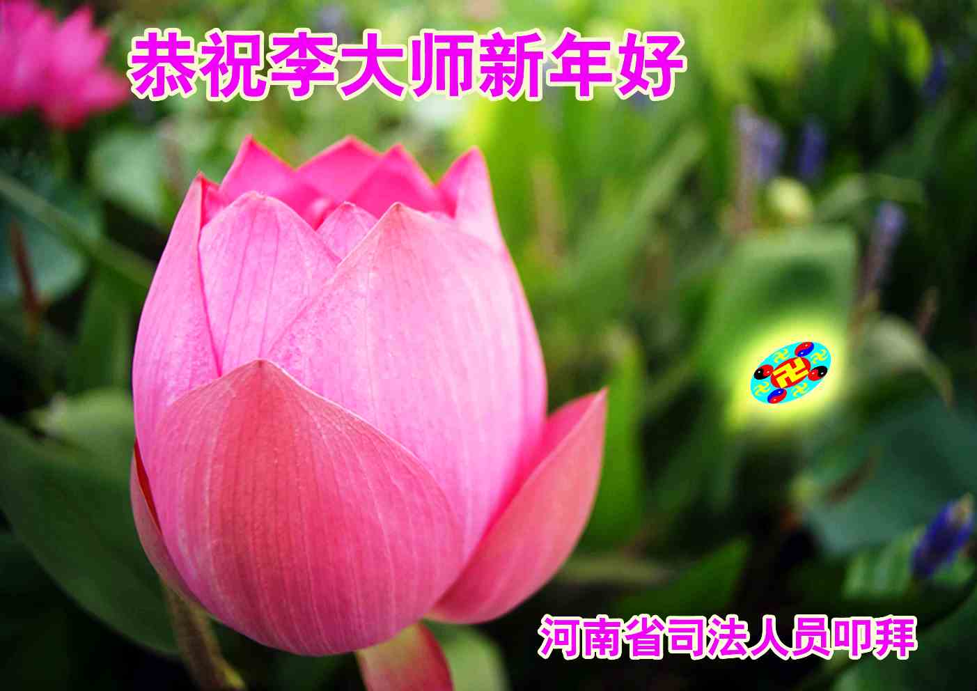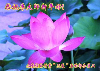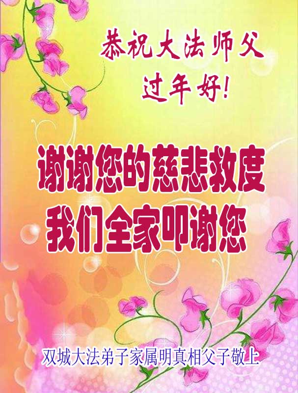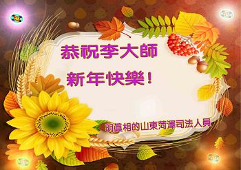 尊敬的李大师,您好! 我们非常荣幸能够有缘成为一个大法修炼者的亲人,有幸目睹了法轮大法的神奇和超常,由于家人给我们讲真相,并给我们做了“三:退.”,教给了我们诚心敬念“法轮大法好,真善忍”九字真言,有好几次,我们在危及生命的危险下,靠着对大法九字真言的诚信,躲过了劫难!我们不知怎样表达我们内心对李大师的感恩!我们一定将法轮大法的福音传给更多的世人,让他们也得到李大师的慈悲救度! 明真相的山东省司法干部恭祝慈悲伟大的李大师新年快乐!