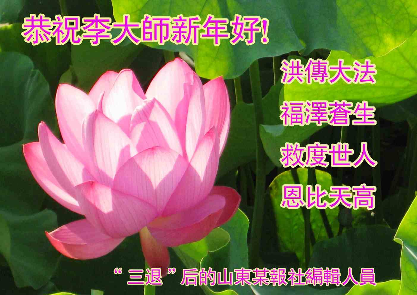 千言万语难以表达对李大师的万分敬仰与感恩!是李大师让我们拥有了美好的未来,是伟大的李大师用慈悲清除了我们心灵的污垢,看清了中共邪*党-的真实面目,得以有了选择美好未来的机会。 我们万分庆幸自己生逢这伟大的时代,庆幸自己在人类的大劫难中免于淘汰能够跨入历史的新纪元。天灭中共在即,我们由衷的奉劝还没有“三:退.”的中国同胞们,珍惜法轮功修炼者赐给你们手中的那一份真相资料,因为那是你生命得救的唯一希望。 我们无限的感恩慈悲伟大的李大师!感恩真善忍宇宙大法! “三:退.”后的山东某报社编辑人员恭祝慈悲伟大的李大师新年快乐!