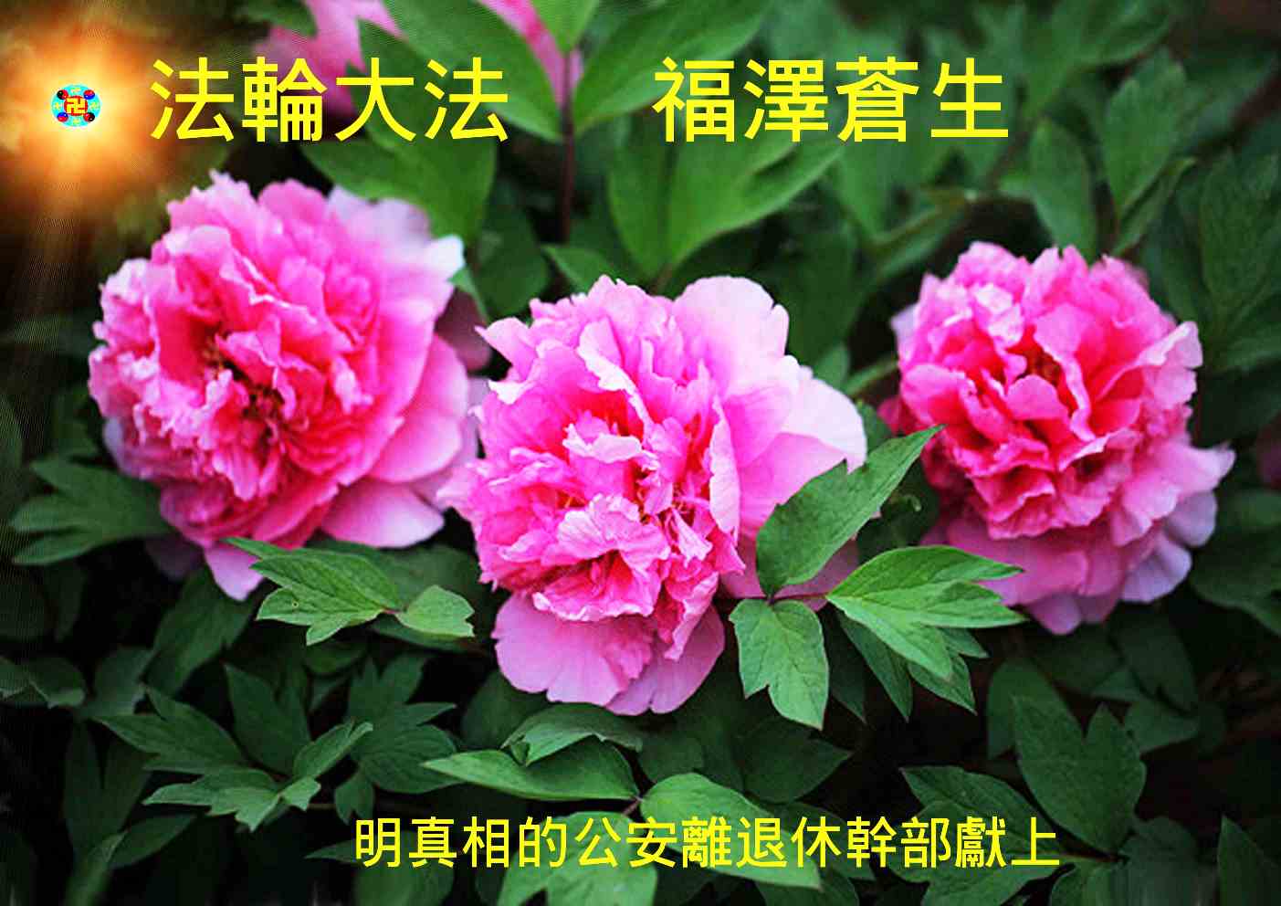 尊敬的李大师您好!我们衷心感谢您对我们的慈悲救度! 自从我们明白了真相,我们知道了人生的意义,不能再象以前那样昏昏迷迷了!我们牢记“法轮大法好,真善忍好”九字真言,遇到不顺心的事,总能柳暗花明又一村,化干戈为玉帛;遇到危险总能逢凶化吉,遇难呈祥。李大师给予我们的是最珍贵的,是人类的任何财物都换不来的! 明真相的公安离退休干部恭祝慈悲伟大的李大师新年快乐!