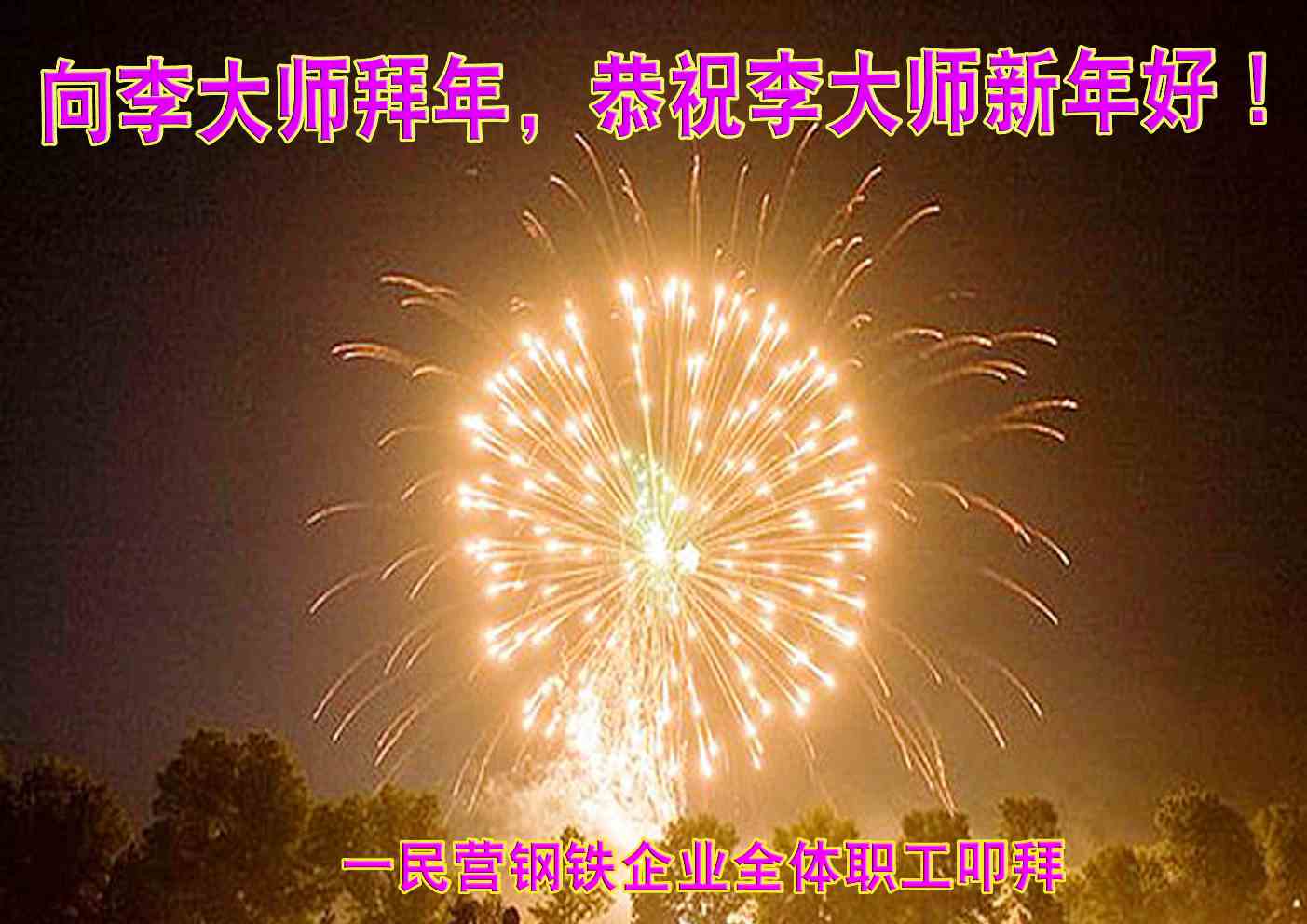 尊敬的李大师您好!您辛苦了!现在越来越多的迹象表明慈悲的李大师就是救世的主神!是您不辞辛苦的洪传“真善忍”宇宙大法,教导出了一批那么优秀的弟子——神的使者,他们像一个个圣洁的天使,将法轮大法的福音传遍世界各地,所到之处,邪恶解体,良知复苏。 我们从大法弟子身上看到了人类的希望!我们更是期盼着李大师早日回国,聆听您的慈悲教诲,我们相信那一天不远了! 明真相的山钢集团离退休干部恭祝慈悲伟大的李大师新年快乐!