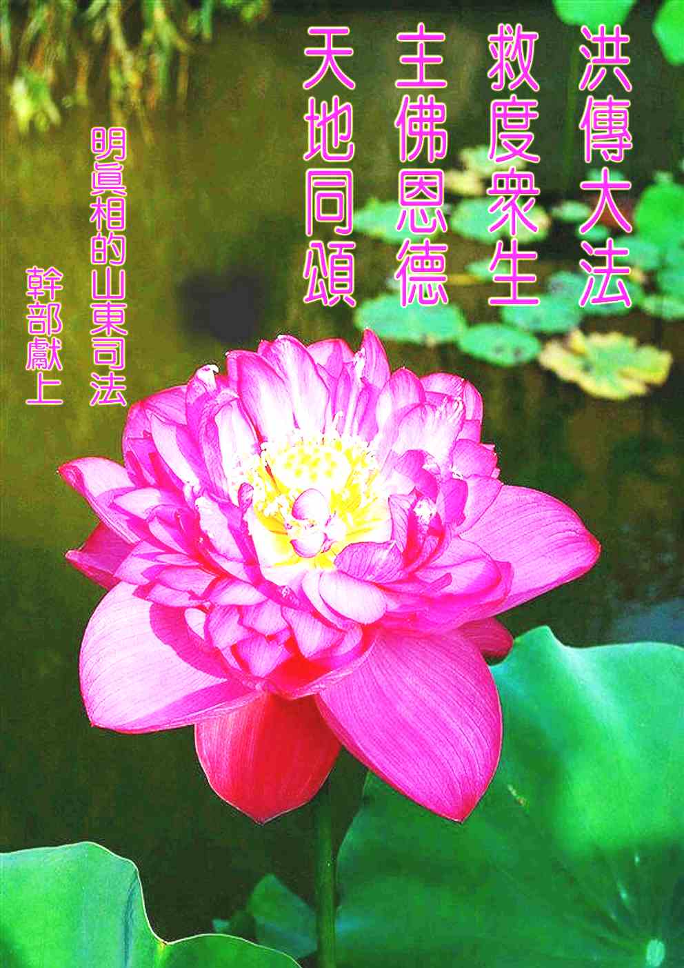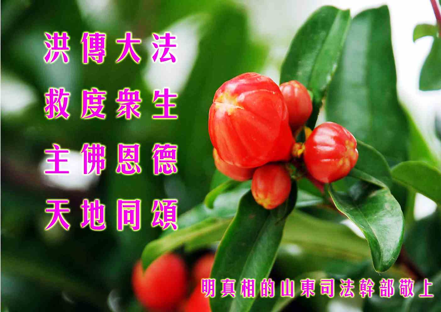 我们衷心感谢李大师对我们的慈悲救度!善恶有报是天理,中共不计后果的迫害一群善良的修炼人,导致的恶果就是道德的缺失,使中华大地天灾人祸不断! 我们庆幸我们明白了真相,得到了李大师的慈悲救度!请李大师放心,我们一定将真相告诉给更多的人,让人们认清邪*党-的害人本质,远离邪*党-,同化“真善忍”,给自己一个美好的未来! 明真相的山东司法干部恭祝慈悲伟大的李大师新年快乐!