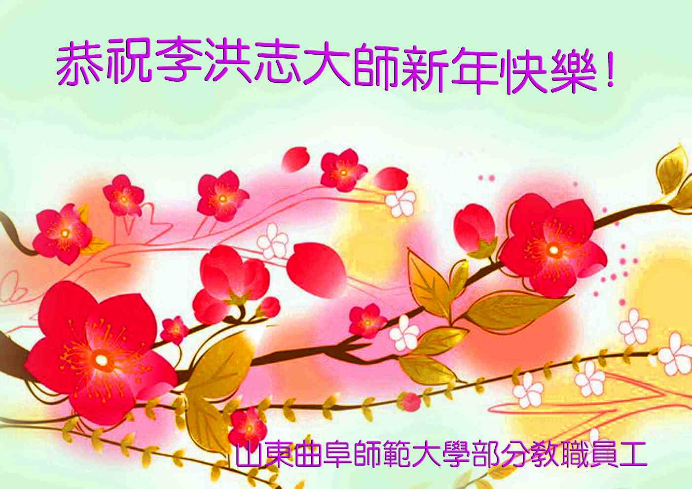 尊敬的李大师,您好! 我们衷心感谢李大师对我们的慈悲救度!请慈悲伟大的李大师放心,善恶有报是天理!一切作恶的都逃不脱人间正义的裁决,中共邪*党-不计后果的迫害一群善良的民众,终究不会逃脱上天的严惩的! 在此希望那些还不醒悟、还在替邪*党-卖命的人们,赶快悬崖勒马,给自己一个选择未来的机会吧,愚迷邪*党-只会做了它的牺牲品,给自己生命的永远造成深深的痛悔!快醒来吧,亲爱的同胞!慈悲的李大师还在给你们机会醒来! 山东曲阜师范大学部份教职员工恭祝慈悲伟大的李大师新年快乐!