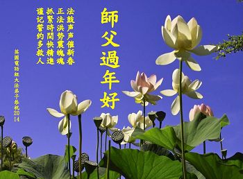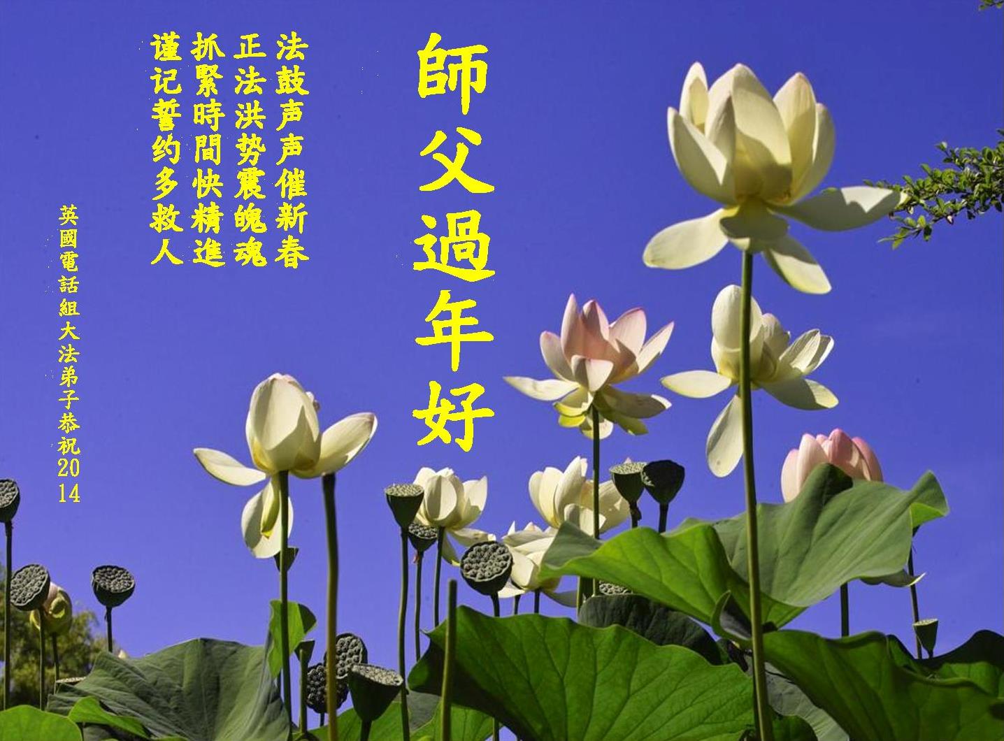 尊敬的师父好!佛恩浩荡,弟子们沐浴在师尊的慈悲法光中深感荣耀和幸运!在新的一年里,我们一定多打电话,多救人,精進实修!谢谢师尊!师尊您辛苦了!师尊过年好! 英国电话组大法弟子恭祝师尊新年快乐!