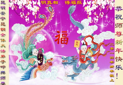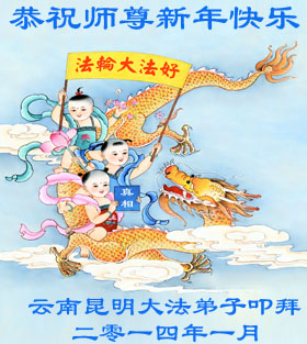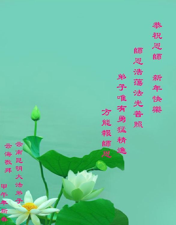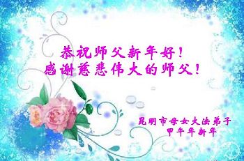我们会在新的一年里,多学法、修好自己,抓紧时间讲真相、劝三:退.,请师父放心! 昆明市四大法弟子恭祝慈悲伟大的师尊新年快乐!