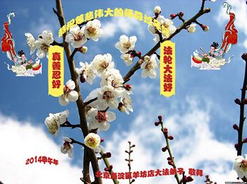 愿师笑 梅花何惧雪压梢 雪融枝更俏 大法弟子除邪恶 救人争分秒 他日法正人间时 梅归愿师笑 北京海淀区羊坊店大法弟子敬拜 2014甲午年 北京朝阳区朝阳北路流落他乡的大法弟子给师父拜年!师父过年好!