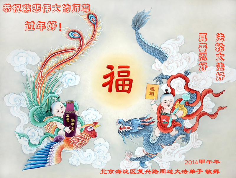 普天同颂 助师正法世间行 撒旦魔王害众生 师尊慈悲担众业 法徒三事炼金身 龙飞凤舞传真相 信师信法不彷徨 他日法正寰宇新 普天同颂圣王恩 北京海淀区复兴路周边大法弟子敬拜 2014甲午年 北京海淀区四位大法弟子敬祝慈悲伟大的师尊新年好!新年快乐!