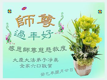 我们一家四口人在新年到来之际发自内心恭祝师尊新年快乐!发自内心感谢师尊慈悲救度! 弟子一定听师尊话,修好自己多救人!迎接师尊早日回国与众大法弟子团聚! 祝师尊新年快乐! 恭贺慈悲伟大的师尊新春佳节快乐!