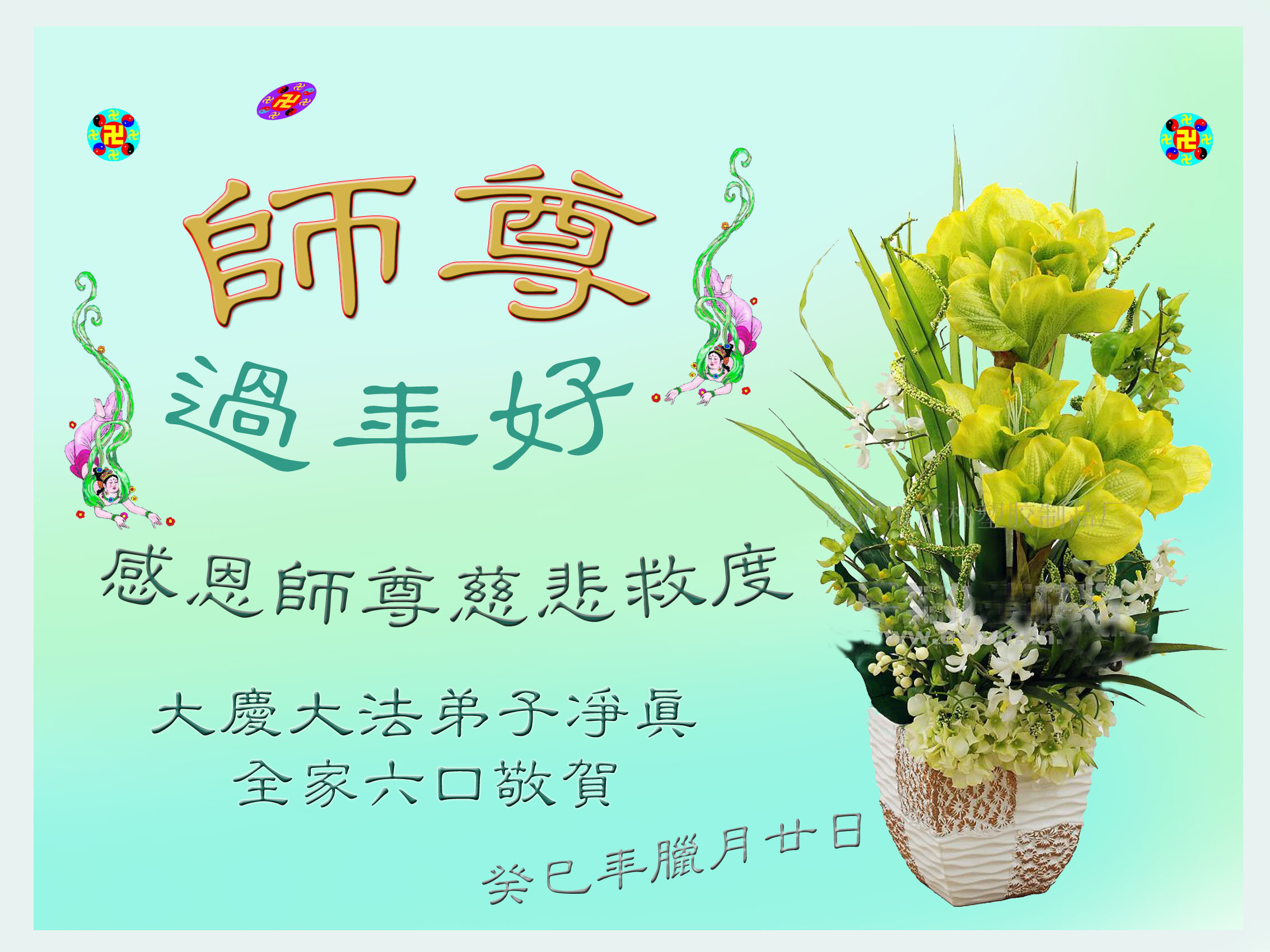 师尊过年好! 弟子全家六口于佛恩浩荡中受益匪浅,用尽人类的语言也难以表达对师尊的感恩,只有精進实修踏踏实实平稳做好三件事兑现史前大愿,才能报答师尊的慈悲救度之恩。 大庆大法弟子净真全家六口 甲午年新年来临之际叩拜师尊 癸巳年腊月廿日 黑龙江省大庆全体大法弟子给师尊拜年,恭祝师尊新年快乐!
