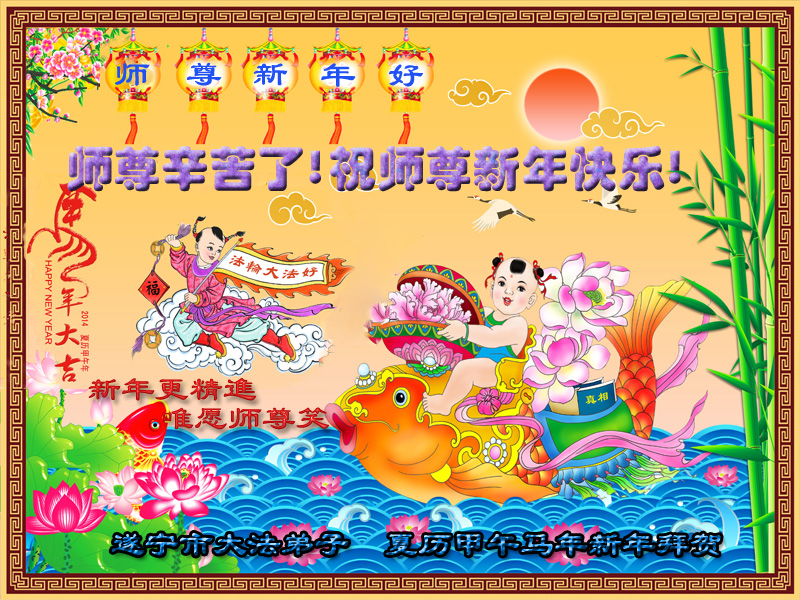 师父好!师父新年快乐!新的一年,弟子们要再接再厉,尽最大努力修好自己,救度众生!再祝师父新年好! 山东省烟台市芝罘区大法弟子敬上 合十 2014年1月25日 辽宁营口鲅鱼圈一学法小组给伟大慈悲的师父拜年!