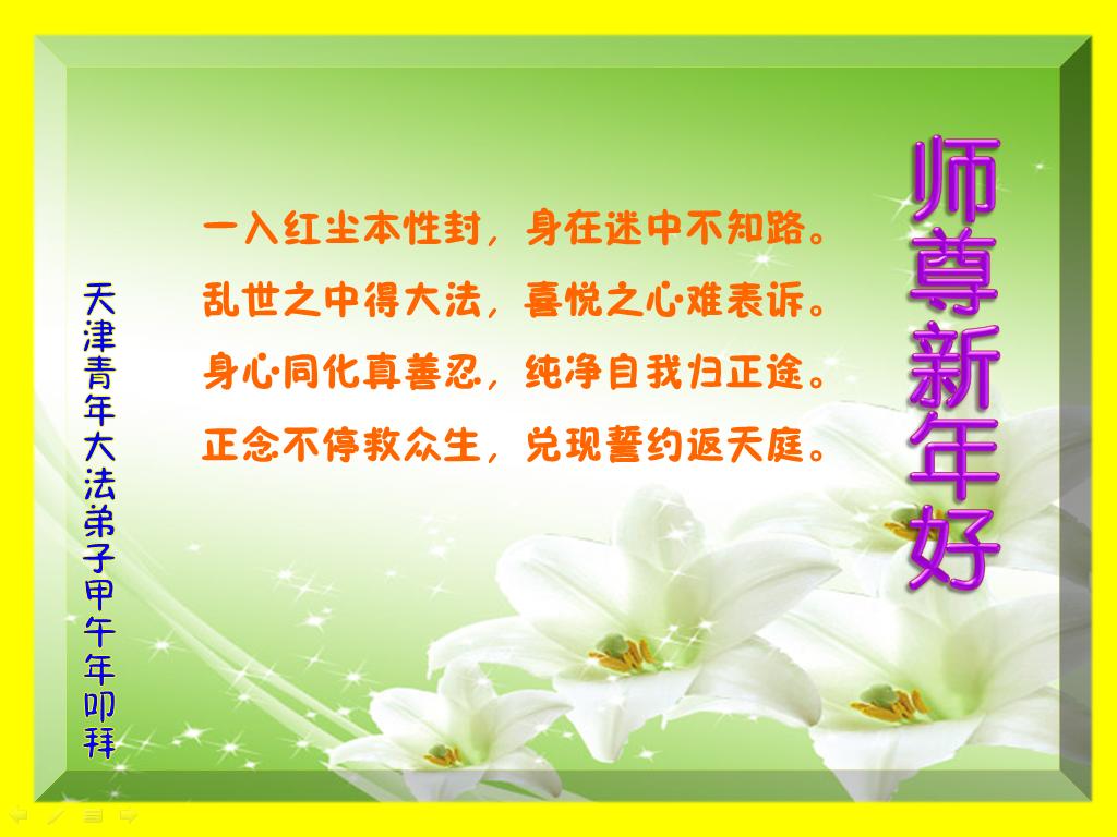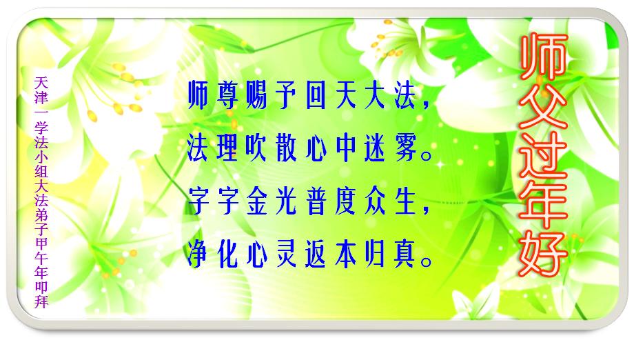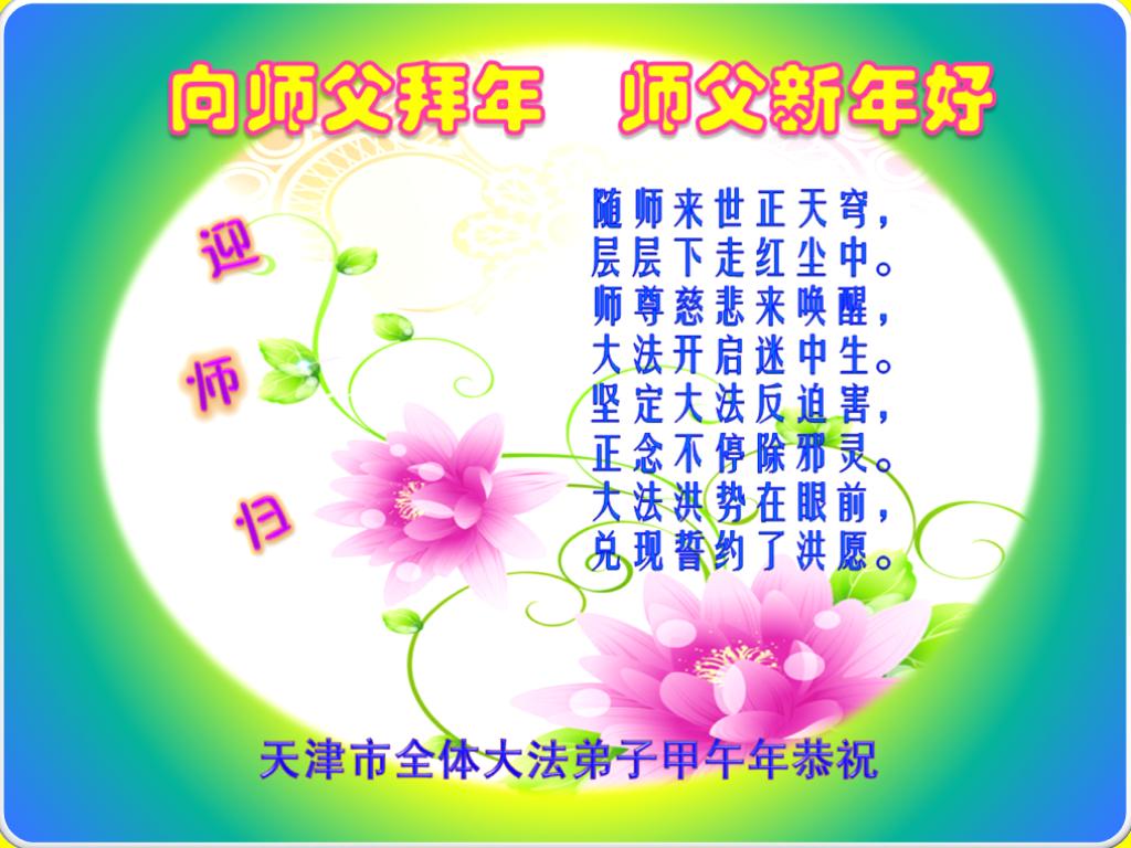 随师来世正天穹,层层下走红尘中。 师尊慈悲来唤醒,大法开启迷中生。 坚定大法反迫害,正念不停除邪灵。 大法洪势在眼前,兑现誓约了洪愿。 天津市全体大法弟子在新年到来之际,向伟大的师父问好,师父您辛苦了,弟子们会牢记师尊教导,精進实修,在新的一年中更好的讲清真相,救度更多有缘人,不辱使命!! 天津青年大法弟子甲午年叩拜师尊:师尊新年好!