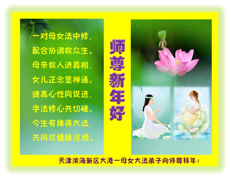 一对母女法中修,配合协调救众生。 母亲救人讲真相,女儿正念显神通。 提高心性同促進,学法修心共切磋。 今生有缘得大法,共同珍惜精進修。 天津滨海新区大港大法弟子恭祝师父新年快乐!