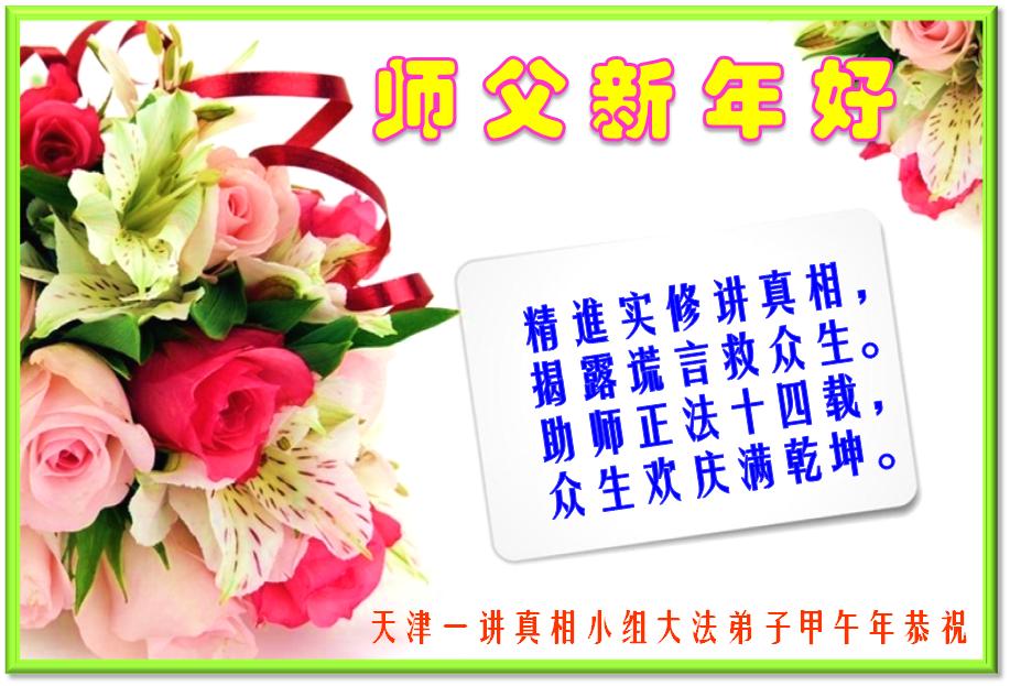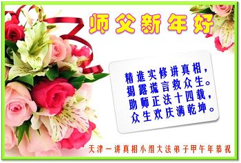 新年到,谢师恩, 修炼如初更精進。 大法徒,迷中醒, 慈悲救度世中人。 讲真相,化有缘, 圆满随师返家苑。 天津一真相小组大法弟子恭祝师父新年好!