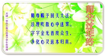 天津大法弟子一学法小组及全家三口:在此跪拜师尊,祝慈悲伟大的师尊新年快乐! 我们会按照大法的要求做好三件事,紧跟师尊走好每一步!谢谢师尊! 天津一大法弟子及家人恭祝伟大慈悲的师父甲午年新年快乐!