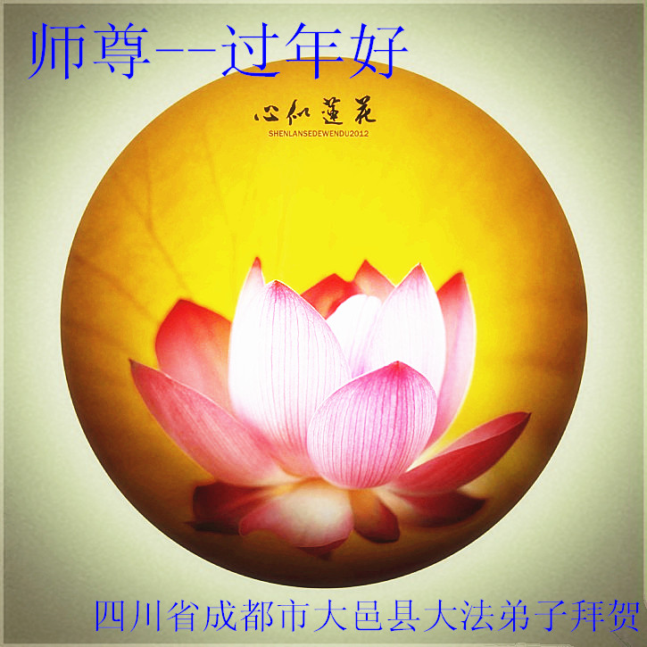 在甲午年即将到来之际,在正法進程将近尾声的今天,在世人越来越多的明白真相,认同大法并谢谢大法救度之恩的可喜形势下,四川成都及周边区县大法弟子衷心恭祝慈悲伟大的师父新年快乐!弟子们将精進实修,再接再厉,做好师父要求做好的三件事,救度更多众生,让师父在新的一年更少几分操劳,多几分欣慰。 四川成都及周边地区大法弟子 四川成都大法弟子恭祝师尊过年好!