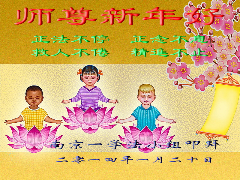 盐城市全体大法弟子在新的一年里, 一定努力做好三件事,珍惜师父延长的这段有限的时间,兑现誓约,抓紧时间多救人,圆容师父所要的,共同完成我们的来世大愿,紧跟正法進程,跟师父回家。 江苏省南京市一家三个大法弟子恭祝慈悲伟大的师尊:二零一四年新年快乐!