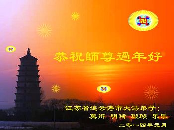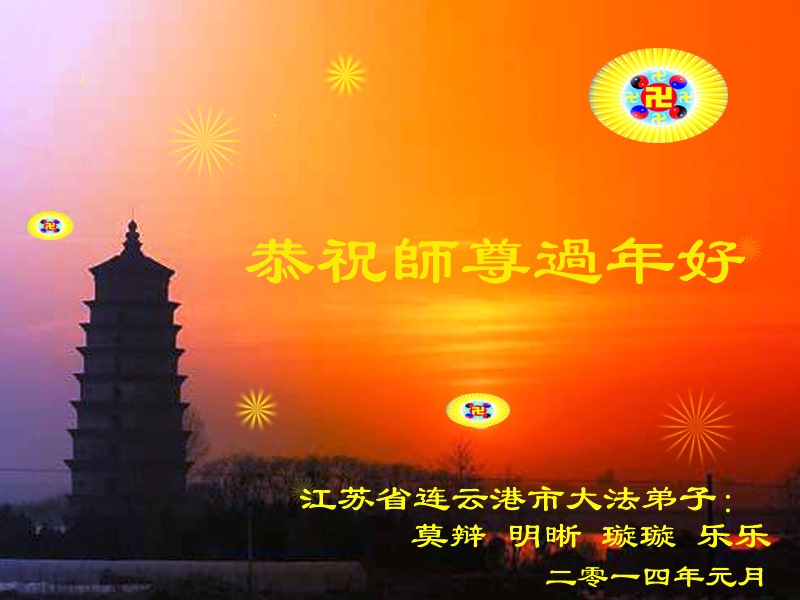 江苏省连云港市大法弟子莫辩、明晰、璇璇、乐乐跪拜师尊:恭祝师尊新年好! 江苏省连云港市大法弟子恭祝师父新年好!