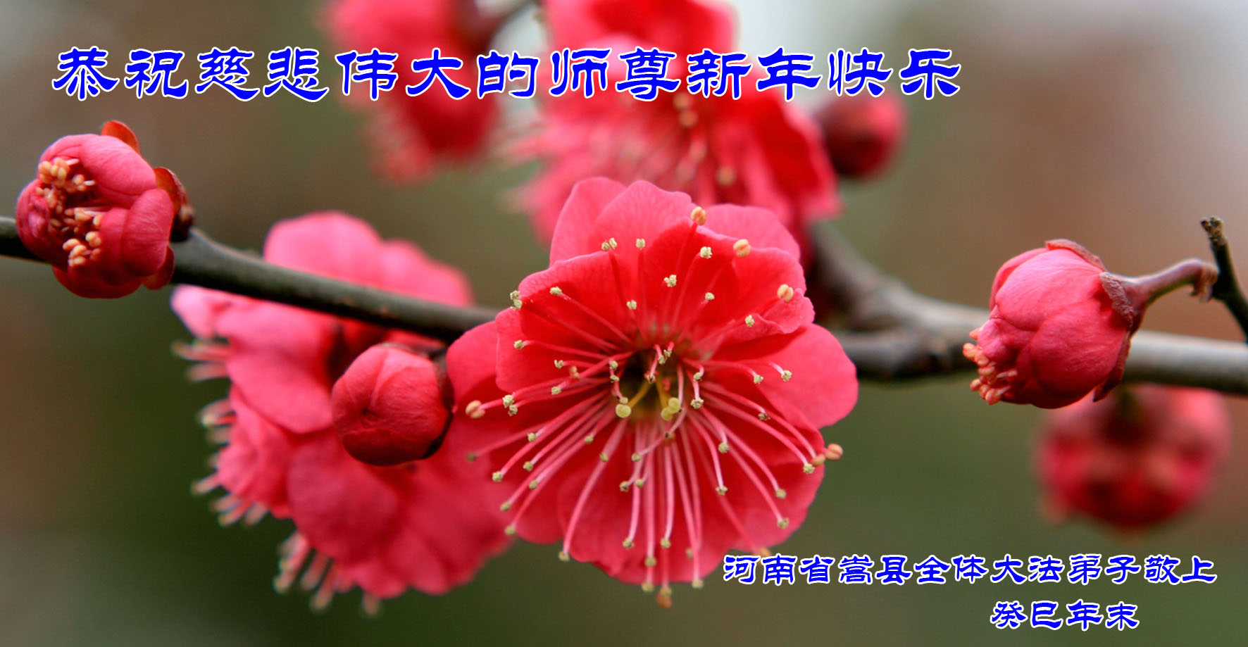 伟大慈悲的师父:在这甲午年将要到来之际,我携一家四口向您问好!在新的一年里我们要认真刻苦修炼,积极救度众生让师父放心。 河南大法弟子叩拜! 河南省濮阳市一学法点大法弟子祝慈悲伟大的师尊新年快乐!