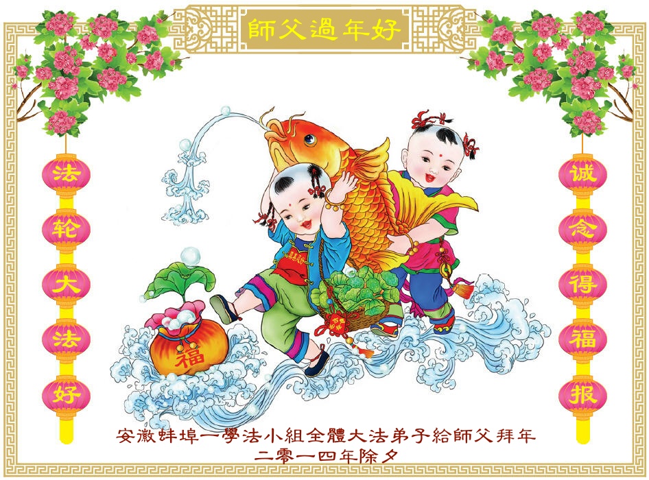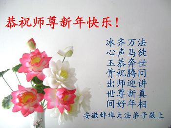 在甲午年来临之际,安徽淮北的大法弟子恭祝慈悲伟大的师尊新年快乐!师尊为众生操尽了心,我们唯有做好三件事,感谢师尊的慈悲救度。 安徽蚌埠一学法小组全体大法弟子恭祝师父新年快乐!