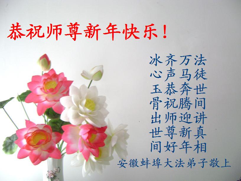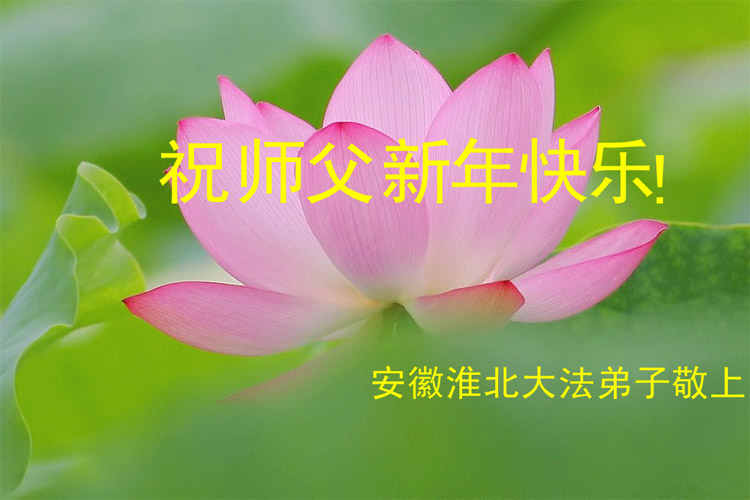师传大法天门开, 万象更新新春来。 助师正法传真相, 朵朵莲花户户开。 安徽淮北大法弟子敬祝师父新年快乐!