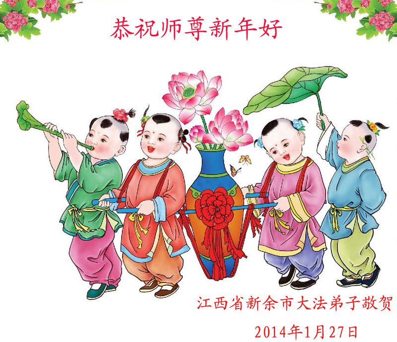 又到新一年,回忆过往十多年的岁月,当我们迷失方向、痛苦彷徨、风雨飘摇的时候,是大法指引着我们正念正行,继续往前走;当我们思想不纯、人心泛起、停滞不前的时候,是大法净化着我们的身心,向内找,提高心性。 弟子们能一路走到今天,无不饱含着恩师的慈悲呵护、正念加持和无尽承受。千言万语道不尽弟子们的感恩之心,无论前路几何,弟子们会修炼如初,一如既往的做好三件事,证实大法,救度更多的众生! 江西省新余市一中年大法老弟子跪拜师尊! 2014.1.26 江西九江县全体大法弟子恭祝师尊新年快乐!