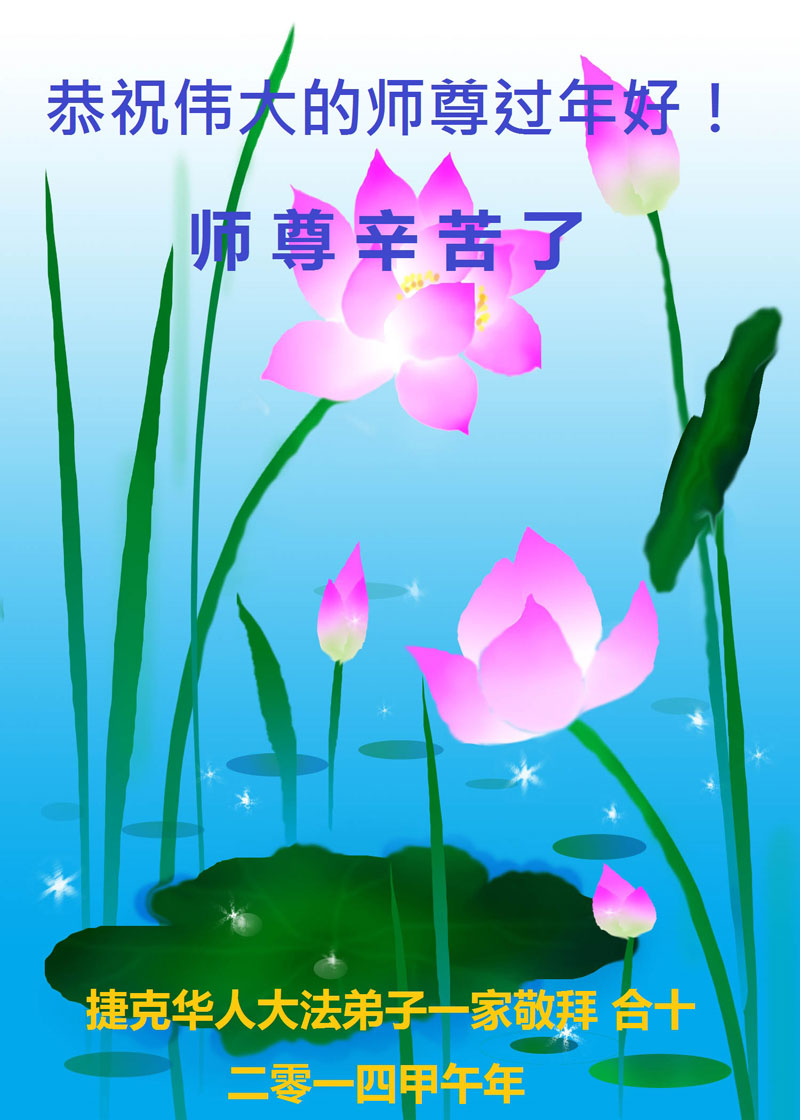 师父,谢谢您!在法轮大法的沐浴中,感恩慈悲无量的佛光照亮我们迷失的心灵;感恩威德无限的大法救度我们于败落的沉泞;感恩师父的慈悲苦度,带领我们走出生命的迷雾,走進“真善忍”展现的壮丽辉煌。在新的一年里,弟子将继续努力和众生一起分享心中的美好与感恩,并把大法的祥和与美好带给更多的世人!谢谢师父!谢谢大法! 捷克华人大法弟子一家恭祝伟大的师尊过年好!
