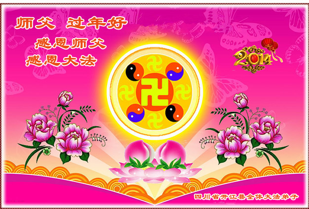 二零一四年的新年 大法弟子向你叩拜; 修炼没有捷径, 我们会更加坦荡, 修炼魔难密布, 在磨炼中我们会更加坚强, 我们要在神的路上奋起直追, 做一名让师尊放心的弟子, 我们不会忘记神的誓约, 我们不会辜负您的期望。 2014年1月27日 吉林省白山市抚松县泉阳地区全体大法弟子恭祝慈悲伟大的师尊过年好!