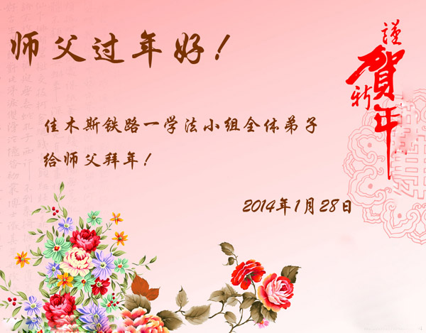 四川省德阳市全体大法弟子恭祝慈悲伟大的师尊新年好! 2014年1月27日 黑龙江省佳木斯铁路一学法小组大法弟子恭祝师父过年好!
