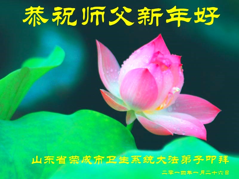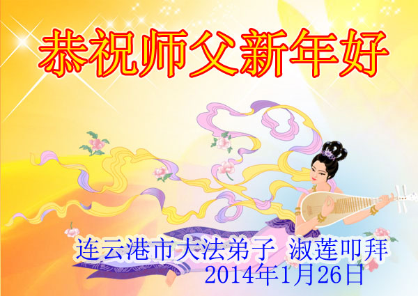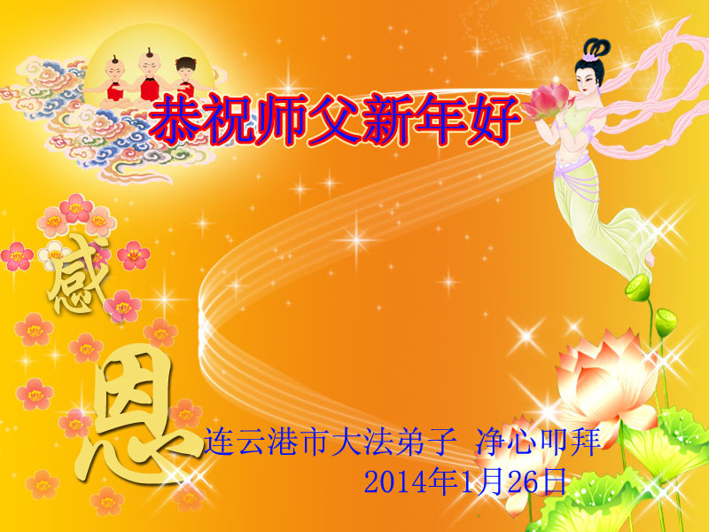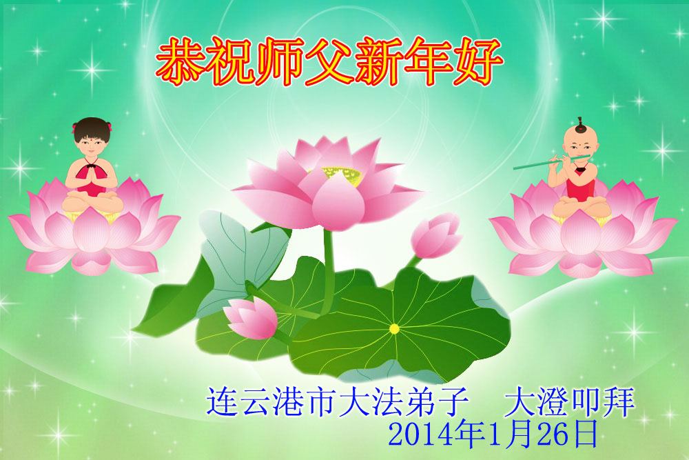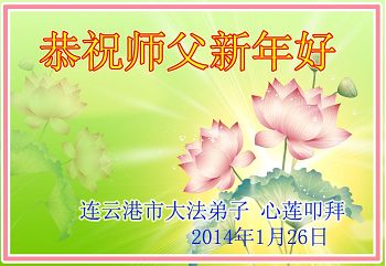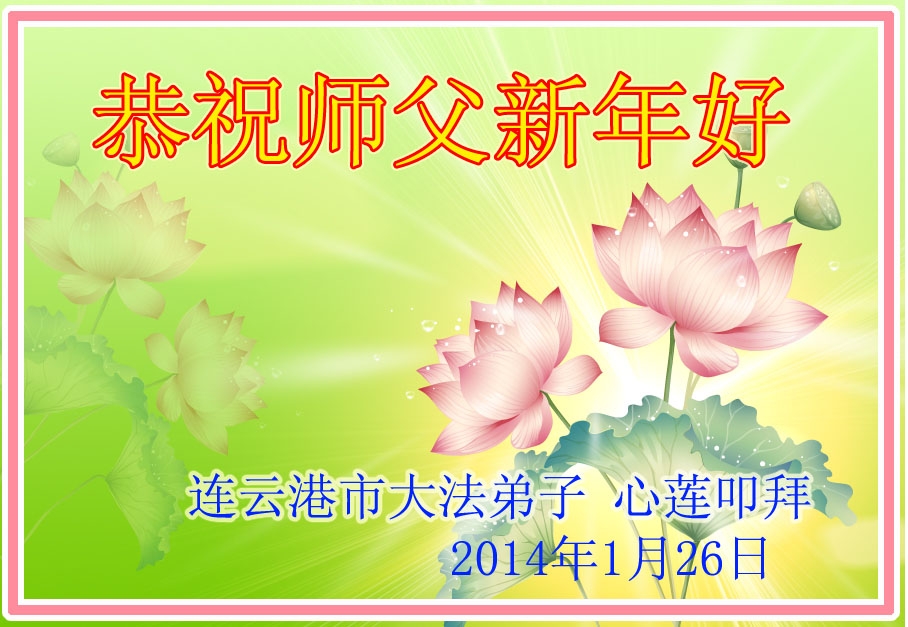 师父辛苦了!感谢您的慈悲苦度,弟子修好自己,虽然得法时间不长,努力做好三件事,跟师父回家。 连云港市大法弟子 心莲拜谢师尊!合十! 2014年1月26日 江苏省连云港大法弟子恭祝师父新年好!
