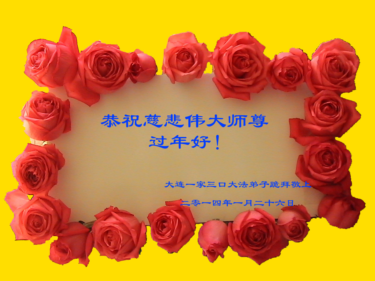 大连一家三口大法弟子跪拜敬上 二零一四年一月二十六日 辽宁省大连三个学法小组共九名大法弟子恭祝慈悲伟大的师尊新年快乐!