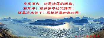 恭祝慈悲伟大的师尊过年好! 师尊辛苦了,弟子们在这里遥拜师尊,恭祝师尊过年快乐! 辞旧岁迎新年,新的一年开始了,弟子们在新的一年里一定努力做好三件事,兑现使命,让师尊多一份欣慰少一份操劳! 弟子们叩拜师尊 月27日 辽宁锦州老大法弟子恭祝恩师过年好!