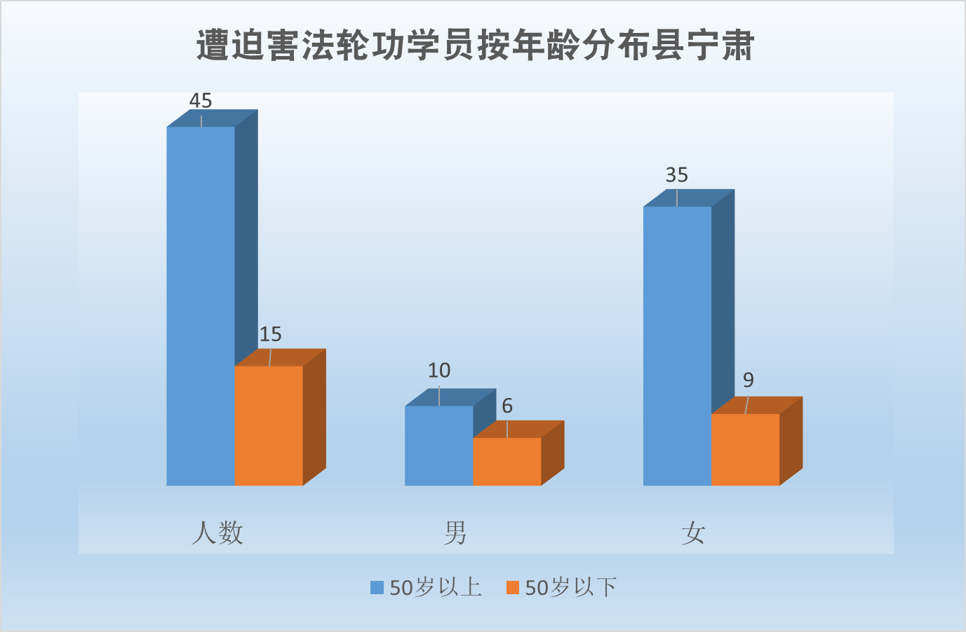 | 【明慧网二零一四年十月十三日】(明慧网通讯员河北综合报道)肃宁县位于河北沧州市最西端,辖6镇3乡(城关镇、梁家村镇、窝北镇、尚村镇、万里镇、师素镇、河北乡、付家佐乡、邵庄乡),面积525平方公里,人口约33万。肃宁虽小,但是其悠久的历史却与华夏起源息息相连。 一九四九年中共窃取政权以来,肃宁百姓也是深受红祸之灾。尤其是一九九九年,中共迫害法轮功及学员至今的十五年,给众多肃宁百姓带来沉重的灾难。 法轮功也称法轮大法,是由李洪志先生于一九九二年五月传出的佛家上乘修炼大法,以“真善忍”为根本指导。经亿万人的修炼实践证明,法轮大法是大法大道,在把真正修炼的人带到高层次的同时,对稳定社会、提高人们的身体素质和道德水准,也起到了不可估量的正面作用。肃宁与法轮功有缘人也深得大法福泽。本文限于篇幅,仅举几例。 韩玉坤,女,五十多岁,尚村镇内村人。一九九七年修炼法轮大法,修炼前多种疾病,如高血压、妇科病等,每天吃药不止,不能下地干活。修炼后身心受益极大,疾病不治自愈。 徐贵婷,女,六十岁,肃宁县城关镇王街村人,曾患有多种疾病:胃病、头晕、神经性心脏病、坐骨神经疼、骨节炎、胆结石、子宫肌瘤等,每天药不离身,苦不堪言。自从九九年修炼法轮大法,徐贵婷满身的疾病不翼而飞,身心健康,精力充沛。 高灵芝,女,五十多岁,肃宁县尚村镇西青口村人,一九九七年开始修炼法轮大法。修炼前,高灵芝身患严重疾病,如:脑震荡后遗症、头晕、记忆力减退、甲型肝炎等,每天药不离身,苦不堪言。修炼后,高灵芝身心健康,疾病全无。 臧金朵,女,五十九岁,肃宁县城关镇王街人,一九九七年修炼法轮大法。修炼后时间不长,身心健康,静脉炎、子宫肌瘤、支气管哮喘、痔疮等多种疾病不翼而飞。 宋继珍,女,六十多岁,肃宁县梁村乡后白寺村人。修炼前曾患多种疾病,如:风湿性关节炎、气管炎、胃病、头疼等,药不离身,不能下地干活。一九九七年喜得大法,修炼后,身心健康,疾病全无,深感无病一身轻的美好。 虽然法轮功为亿万世人带来健康的身体、使他们修心向善,但是宵小之徒江泽民出于恶毒的妒嫉,于一九九九年“七·二零”悍然下达迫害指令。在肃宁受迫害的中老年法轮功学员占迫害总数的75%,这些中老年法轮功学员几乎人人在修炼以前都身患多种疾病,通过修炼他们全部达到祛病健身以及道德的提升。 一、迫害综述 根据明慧网报道和实地走访受迫害学员初步统计,在迫害发生的十五年里,肃宁县被中共当局骚扰、绑架法轮功学员至少63人116人次,其中迫害致死2人;非法判刑5人7次;劳教7人4次,有3人因体检不合格等原因实施劳教未遂;给这些法轮功学员造成直接经济损失至少45万余元。 更加令人发指的是,在本文列举的63名遭迫害的法轮功学员中,除一人年龄不详和二例迫害致死案例外,60例迫害案例中50岁以上(含50岁)遭迫害的中老年学员高达45人;50岁以下15人。中国历来讲究尊老,邪*党-却针对这些曾经百病缠身、修炼法轮功以后身心受益的老人实施残忍的迫害,这一暴虐行径也恰恰说明邪*党-之邪恶古今罕有。 ◆被迫害致死法轮功学员:张玉兰(女)、卫朝宗(男) 卫朝宗,男,40岁,肃宁县万里乡卫家庄村人。卫朝宗于2002年5月1日被绑架到石家庄劳教所,遭受3个月的野蛮摧残,于8月10日在家中含冤去世。其妻子杜玉琴也被非法判刑8年,当局不准她为丈夫送葬。 张玉兰,女,77岁,河北省肃宁县大法学员。得法前患脑血栓、心脏病、糖尿病等多种疾病,1997年修炼大法后康复。2001年6月3日夜间,公安局李臣祥等人到她家搜查、抄家,女儿被抓,女婿被绑架并非法关押。从这以后,邪恶多次骚扰、恐吓,使其身心受到极大伤害,导致旧病复发,生活不能自理,于2005年1月12日含冤去世。 ◆50岁以上(含50岁)遭迫害学员名单: 男性:裴文海(五十多岁)、黄振英(七十来岁)、张俊明(七十多岁)、何松峰(五十多岁)、裴兰刚(近八十岁)、库敬军(五十多岁)、库敬营(五十多岁)、何丙军(七十四岁)、高肥田(五十多岁)、尹俊卿(六十五岁) 女性:宋凤芝(五十多岁)、赵香菊(六十多岁)、冯秀凡(六十九岁)、何秀娟(七十多岁)、臧金朵(七十来岁)、王瑞英(七十多岁)、候汝贤(六十九岁)、王占领(五十岁)、范书平(五十多岁)、裴秀芬(七十多岁)、田艳蒲(五十多岁)、任素贞(五十多岁)、于凤兰(七十多岁)、刘淑兰(六十多岁)、徐贵婷(六十五岁)、宋继珍(七十来岁)、韩玉坤(六十多岁)、胡艳香(六十多岁)、付秀文(七十来岁)、刘俊英(七十多岁)、付考苓(五十多岁)、郭凤兰(七十多岁)、李素芹(五十多岁)、李秀敏(六十九岁)、刘素然(六十多岁)、李小伟(六十多岁)、梁小柳(六十多岁)、杨兰英(五十多岁)、宋体心(五十多岁)、齐宽女(六十多岁)、王丽平(五十多岁)、何秀芝(七十八岁)、朱秀荣(七十多岁)、高灵芝(五十多岁)、邢明凤(五十多岁) ◆ 50岁以下遭迫害学员名单: 男性:王成(三十多岁)、葛成业(三十多岁)、陈耐营(四十多岁)、杨广乐(回族,四十来岁)张秋良(四十多岁)、何卫国(四十多岁) 女性:李香芬(四十多岁)、李俊艳(五十来岁)、杨杏伟(四十多岁)、马秀英(五十来岁)、钱小凤(四十多岁)、扈红娟(四十多岁)、李艳俊(四十多岁)、吴双霞(四十多岁)、何艳菊(四十多岁) ◆年龄不详: 女性:郝桂兰 遭迫害学员年龄对比列表: | 遭迫害学员年龄段 | 人
