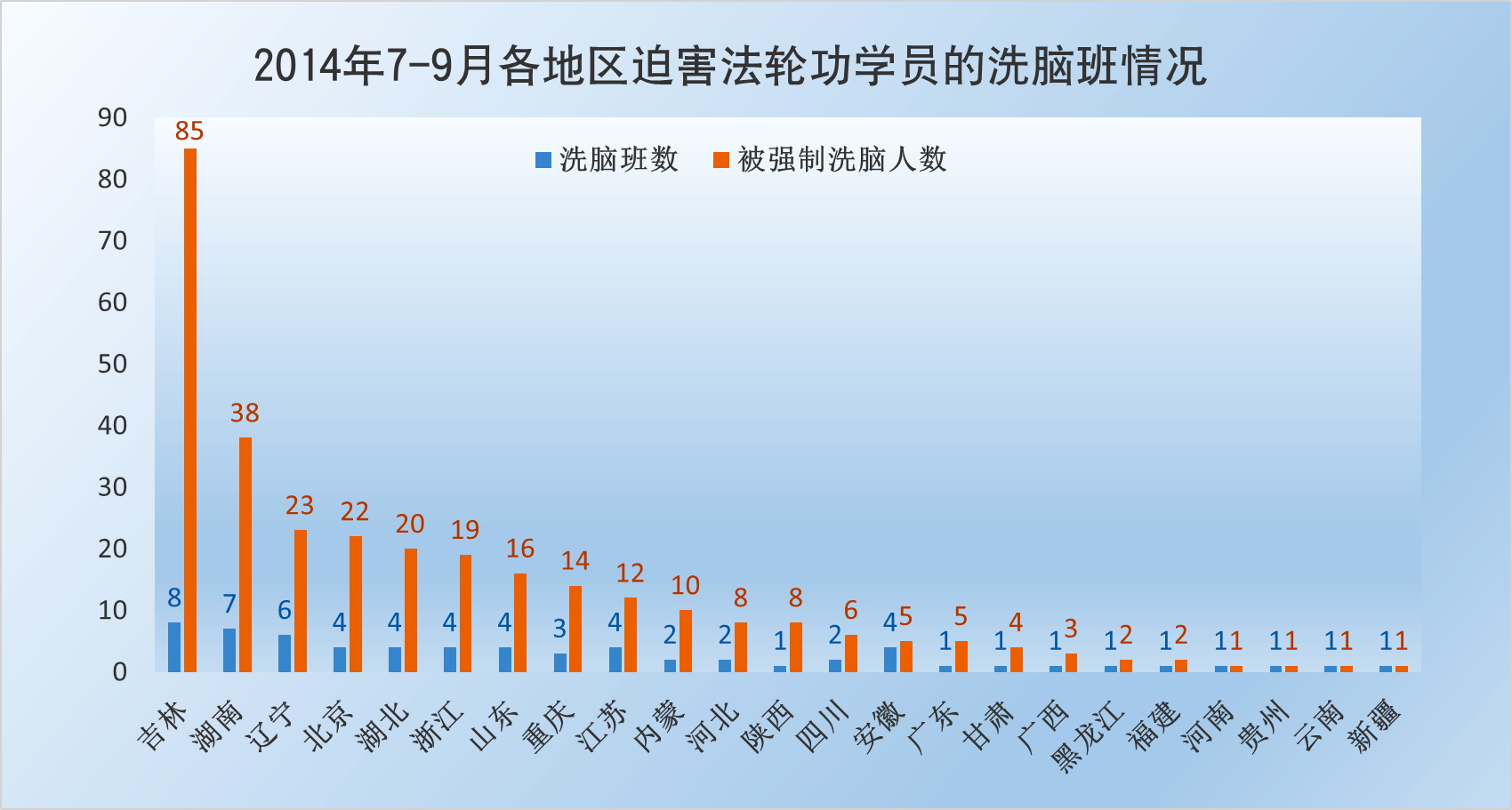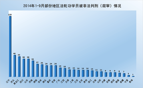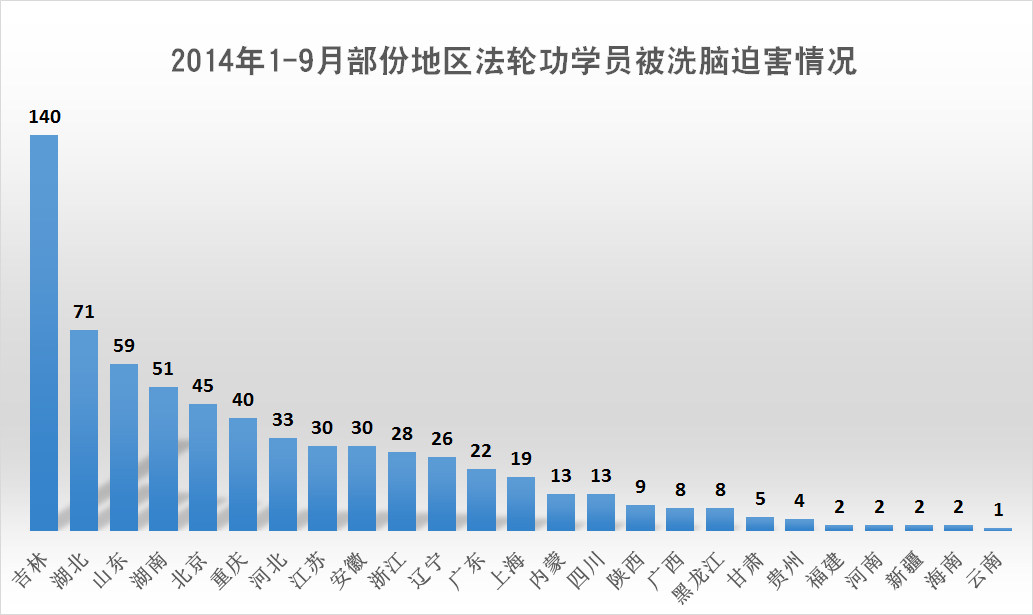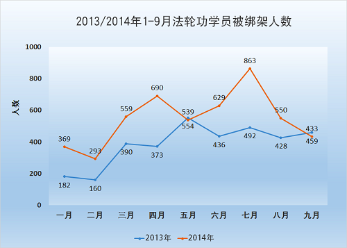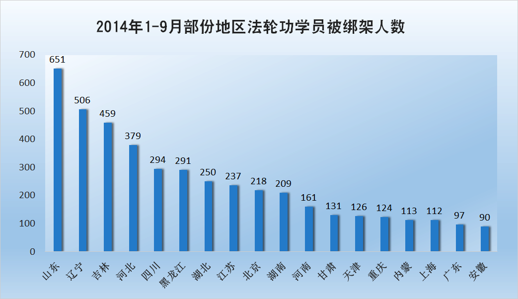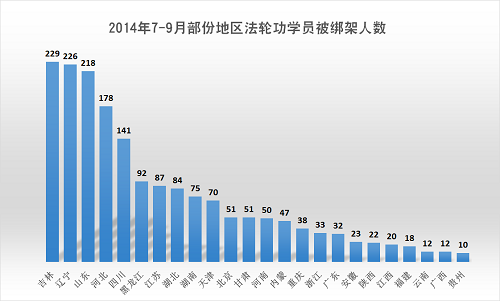 | 【明慧网二零一四年十月八日】(明慧网通讯员大陆综合报道)本文数据是动态跟踪明慧网讯息统计所得。这些讯息是大陆法轮功学员在困难情况下突破封锁传递出来的,并不是法轮功学员被迫害的全部事实。本文用意在于通过数据一览中共邪*党-迫害法轮功的概貌和地区分布。 其实,真正的数据是那些迫害法轮功的公安、国保、“六一零”、检察院、法院、监狱部门最清楚了。可是别忘了,除了国际组织对迫害凶手的追查外,还有对迫害数据最清楚的,一个不差。 这个浩瀚的宇宙、微观空间,专门有记录人干坏事的神灵。别说谁绑架了人、使用了酷刑,就是一个动作、一个恶念,都有记载,分毫不差。所以奉劝那些参与迫害法轮功的相关人员,保留好相关证据,争取立功赎罪。否则,现在有一句人们常说的话:“恶报来临时,党在哪里?” 本文包括以下内容:⑴七至九月法轮功学员被绑架情况;⑵一至九月法轮功学员被迫害情况。 一、七至九月法轮功学员被绑架情况 二零一四年七至九月,中共邪*党-持续骚扰、绑架法轮功学员,发生了多起有计划、有预谋的群体绑架事件。据明慧网讯息,大陆除西藏、海南外的二十九个地区(省、直辖市、自治区)均发生了法轮功学员被绑架的事件。特别是七月份,被绑架法轮功学员人数大幅上升,至少达863人。 七至九月份,法轮功学员被群体绑架事件频频发生。据截止到二零一四年十月六日的明慧网资讯统计,七至九月份法轮功学员被绑架人数至少1846人。比二零一三年同期的1379人(数据来源:明慧网《2013年:迫害与恶报》)上升了百分之三十三点九。如下图所示意。 其中, 七月份:被绑架至少863人; 八月份:被绑架至少550人; 九月份:被绑架至少433人; 七至九月份被绑架的1846名法轮功学员中,吉林229名,辽宁226,名山东218名,河北178名,四川141名,黑龙江92名,江苏87名,湖北84名,湖南75名,天津70名,北京51名,甘肃 51名,河南50名,……。如下面图和表1所示。(表中颜色浓度由浓到淡体现迫害的程度,浓度越大,迫害程度越高,全文同)。 表1 七至九月各地区法轮功学员被绑架人数 | 地区 | 被绑架人数 | 地区 | 被绑架人数 | 地区 | 被绑架人数 | | 吉林 | 229 | 北京 | 51 | 福建 | 18 | | 辽宁 | 226 | 甘肃 | 51 | 云南 | 12 | | 山东 | 218 | 河南 | 50 | 广西 | 12 | | 河北 | 178 | 内蒙 | 47 | 贵州 | 10 | | 四川 | 141 | 重庆 | 38 | 山西 | 9 | | 黑龙江 | 92 | 浙江 | 33 | 上海 | 5 | | 江苏 | 87 | 广东 | 32 | 新疆 | 5 | | 湖北 | 84 | 安徽 | 23 | 青海 | 5 | | 湖南 | 75 | 陕西 | 22 | 宁夏 | 3 | | 天津 | 70 | 江西 | 20 | 海南 | 0 | | 合计 | 1846 | 从上面图和表1可以看出,七至九月份除西藏、海南外的二十九个地区(省、直辖市、自治区)均发生了法轮功学员被绑架的事件。吉林、辽宁、山东、河北是绑架法轮功学员疯狂地区,四川、黑龙江、湖北,江苏、湖南、天津次之。 七至九月,辽宁、山东、吉林、河北、四川、黑龙江、河南、天津、甘肃、江苏、陕西、广西、重庆、北京、湖南、内蒙古16个省市区绑架规模五人(含)以上事件发生了至少44起,至少涉及453位法轮功学员。 七至九月,辽宁、山东、吉林、河北、江苏、四川、北京绑架规模十人(含)以上事件至少18起,至少涉及294位法轮功学员。 七至九月,吉林、北京、河北、江苏绑架规模二十人以上事件至少5起,至少涉及136位法轮功学员。 吉林长春市七月十八日:二十九名法轮功学员被绑架 七月十八日长春市至少有二十九名法轮功学员被绑架。农安县:刘琳、谭大丰、高占英、郭秀英、刘迎新、王成江、冷晓丽和刘碧雪;长春市:刘桂云、伍桂春、齐姓、百方、赵金凤、杜和(音)、马翠梅(音)、侯桂香、孙淑英(音)、丽君(不知姓,六十多岁)、刘晶秀、陈春玲、卫星路两名、老魏、吴环、王春华、小洁、小陆、胡姨、陈彤。法轮功学员都是被辖区派出所绑架的,或者是警察直接闯入家中绑架,或者是人刚出家门就遭绑架,或者在学员家附近遭绑架。其中孙百方等七位法轮功学员被警察翻墙入室绑架。 辽宁本溪市七•二零前夕:十五名法轮功学员绑架 二零一四年七•二零前夕,辽宁本溪市”六一零”制造恐怖气氛,绑架了十多名法轮功学员:赵福贵、张凤云、刘斌、冉芳、谢瑞雪、谢瑞华、徐杰和她的女儿、陆锦、孙淑瑜、魏建平、胡春燕 、宫淑玲、崔兆玲、刘玉秋十五人。 河北省沧州市八月十七日:42名法轮功学员被绑架 二零一四年八月十七日,河北沧州市公安局一个副局长带领十多名警察骗开皇家壹里小区一居民家,十多名便衣警察一拥而入,闯入室内,绑架了正在交流讲真相心得体会的42位法轮功学员。法轮功学员来自沧州、天津、武清、承德、青县、盐山、南皮、献县等地。接连数天,警察将各区县市法轮功学员带回当地,非法抄家和关押。参与绑架的有沧州市局警察、运河分局国保队,还有巡警大队的巡警等。被绑架的42位法轮功学员有天津市武清区孙元龙、刘立新、赵翔、孙满园;沧州李丽、康兰英、唐建英、徐凯、曹延香、冉阿姨、盐山县张君、南皮县常寿轩、赵俊茹等。 吉林省通化市九月二日:30多名法轮功学员及家属被绑架 九月二日,吉林省通化市及东昌区的政法委、“六一零”、东昌分局、刑警队、特警队、二道江分局以及老站、团结、新站、东昌、环通等各派出所警察,从凌晨三点多开始蹲坑,早晨六点到八点左右,绑架了30多