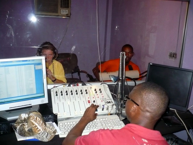 | 【明慧网二零一四年十一月十四日】(明慧记者周文英综合报道)二零一零年一月十二日,位于北大西洋的岛屿海地,在一场地震中饱经创伤。据统计,约三十万人死亡,三百七十万人受灾。然而,那里的法轮功修炼人中,没有人在地震中受灾,他们住的房子也没有受损,其中一人住在震灾中心,也是安然无恙。当地的法轮功学员说:“有师父保护,一切都好。” 时间上溯到二零零八年五月,法国法轮功学员阿妮塔第一次来到海地。她带来了六十多本《转法轮》,送给海地想修炼法轮功的人。同年九、十月,她再次来到海地。期间,她受到几家电台的邀请,第一次,她得到三十分钟的时间介绍法轮大法。第二次,她回答听众的问题。第三次,没有时间限制。法轮大法的福音在海地传播。  图1:二零零八年十月,阿妮塔在王子港地方电台介绍法轮功。 |
