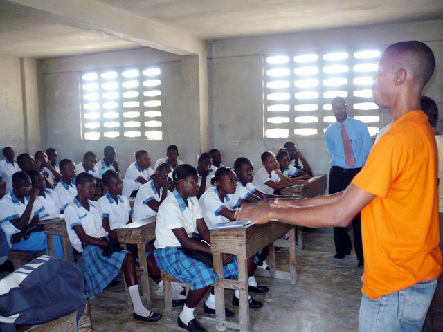 与此同时,在王子港附近的Croix-des-Bouquets广场,由市长签字,设立了海地的第一个法轮功炼功点。每个星期六的上午,都有法轮功学员在一起炼功,还有几个地点有集体学法。 二零一二年阿妮塔第三次到海地时,这个炼功点仍然存在,炼功人数也在不断地增加。 在海地,阿妮塔向所有她遇到的人讲述法轮功真相,包括法国大使馆、海地驻瓜德罗普(法国海外省)副领事夫人、医生、律师、校长、记者、电台主持人、教师、市长代理等。她还向四所小学、四所中学的全体师生介绍法轮功并现场教功。小红帽小学校长继而将法轮功定为教学课程,每星期五早上七点集体炼功,人数达一百五十人。  图2:中学学生正在观看法轮功演示(二零零八年) |